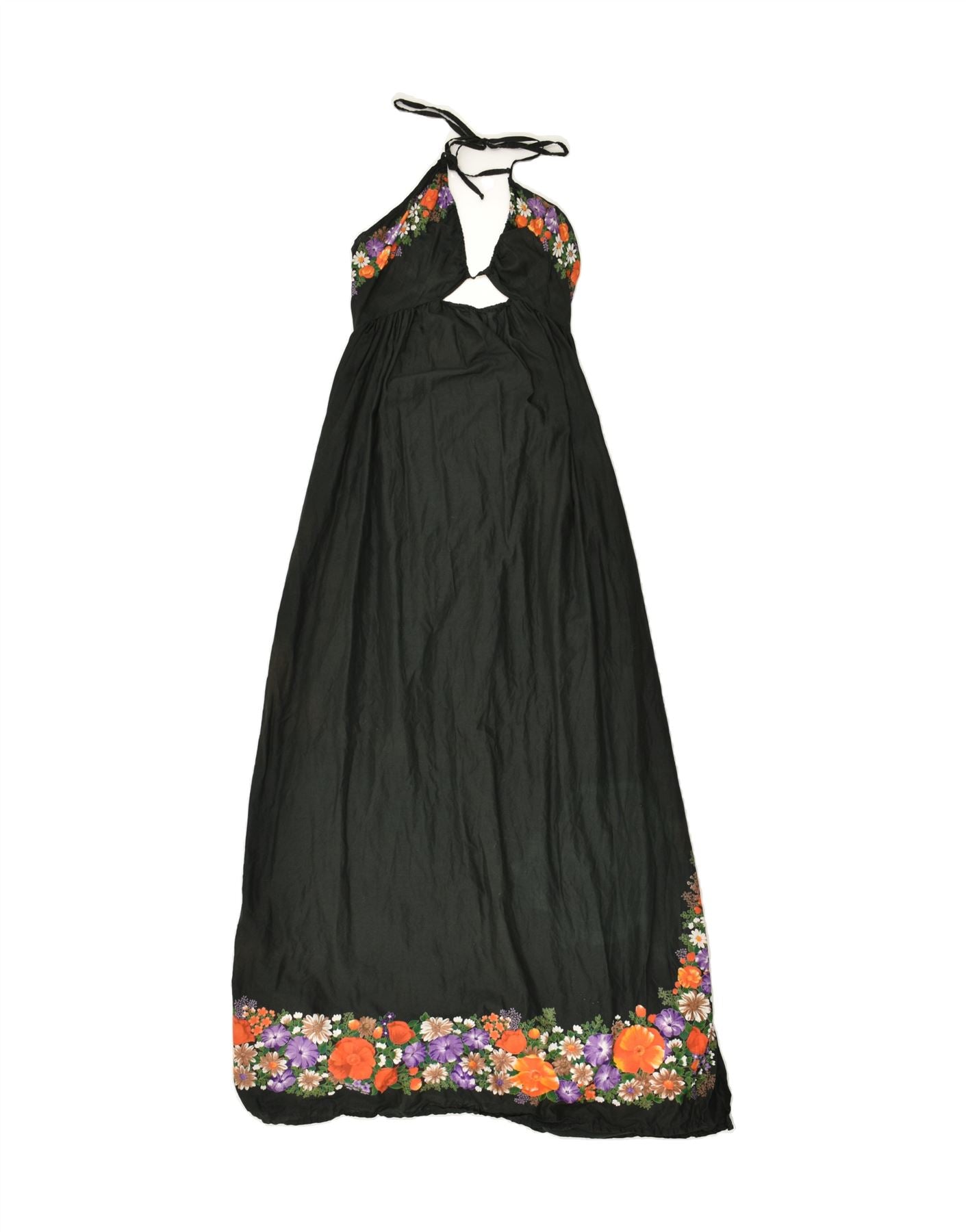 ВИНТАЖНОЕ женское платье макси без рукавов, Великобритания 0 2XS, черное с цветочным принтом