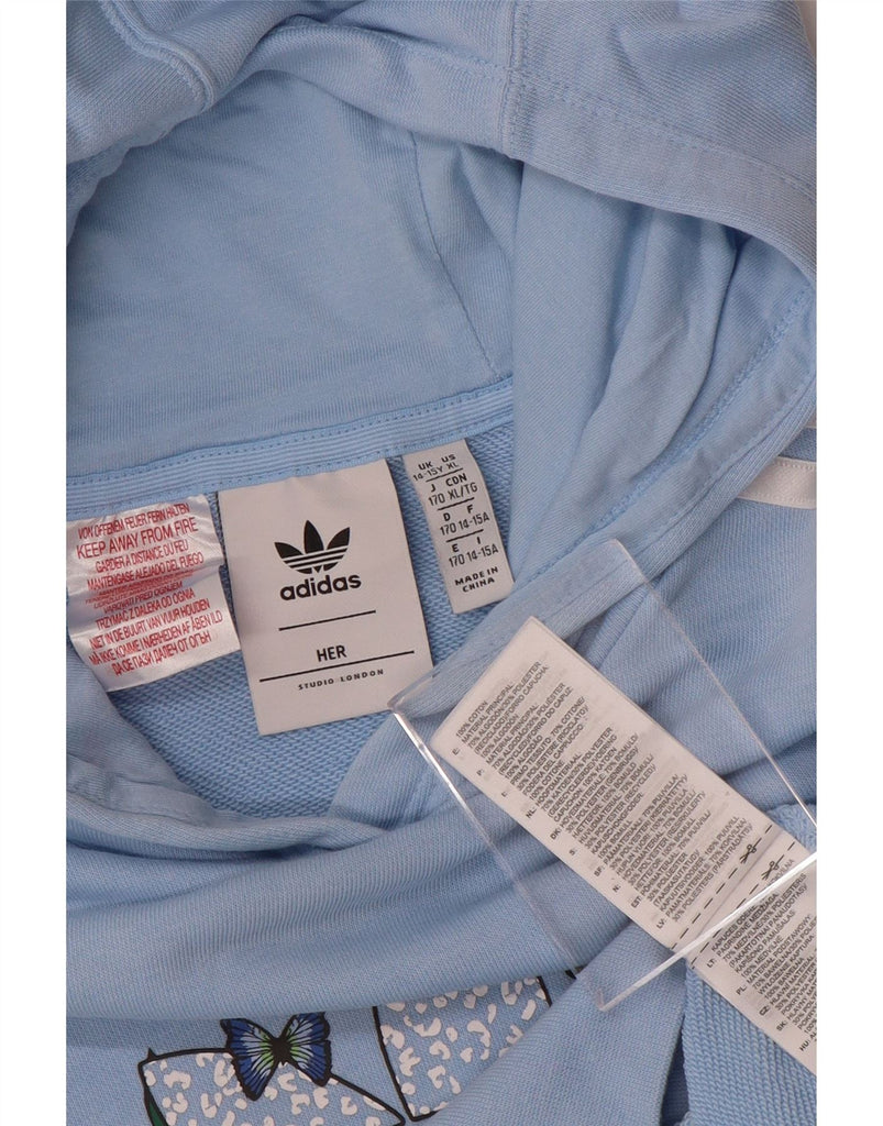 ADIDAS Girls Her Crop Graphic Hoodie Jumper 14-15 Years Blue Floral Cotton