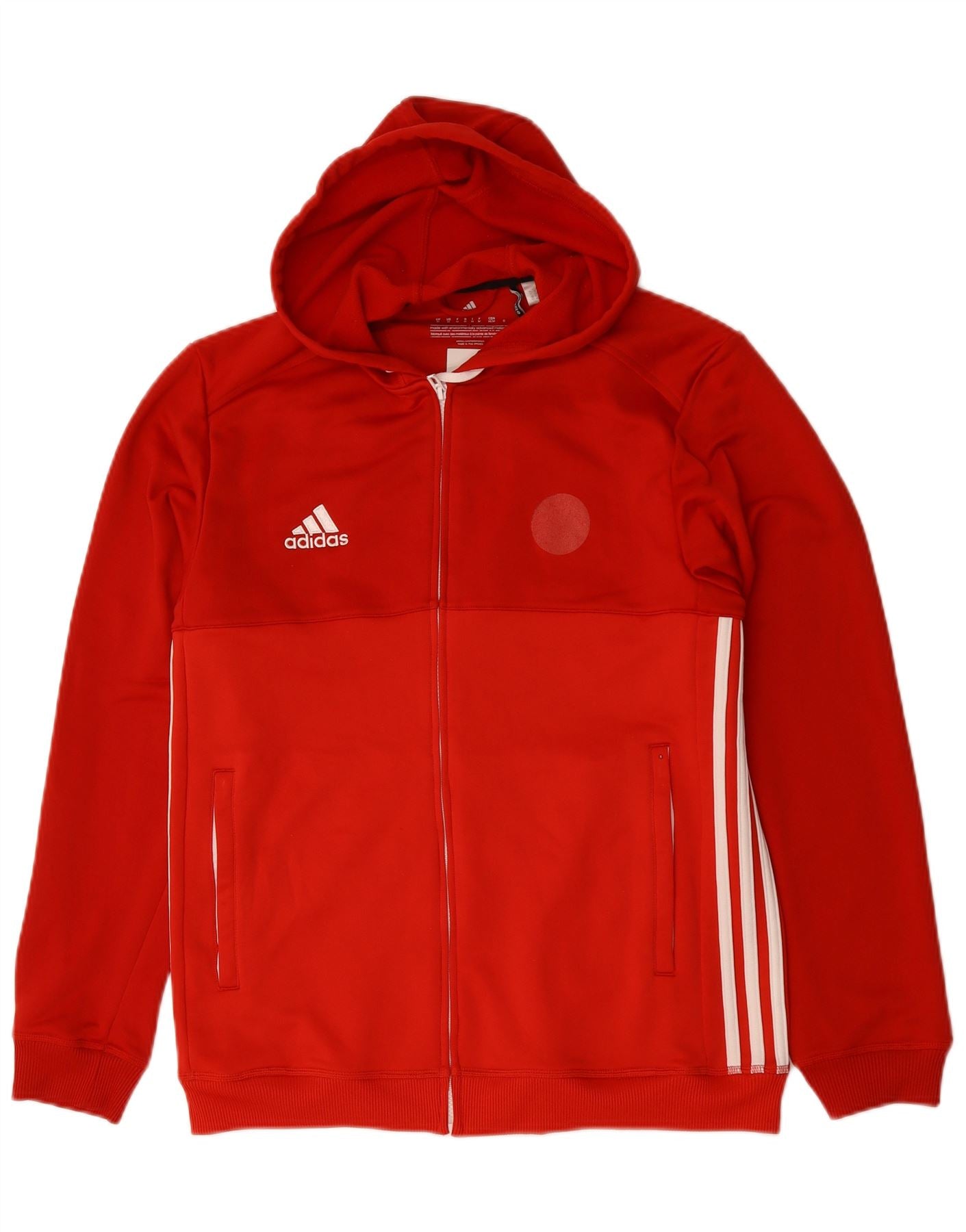 - Описание ИИ: Мужской свитер с капюшоном Adidas на молнии изготовлен из гладкого красного полиэстера. Он имеет полную застежку-молнию и высокий воротник, ведущий к удобному капюшону. Длинные рукава и стандартный крой обеспечивают легкость движений. Дизайн включает в себя культовый логотип Adidas и белые полосы на рукавах. Практичные карманы встроены спереди.
