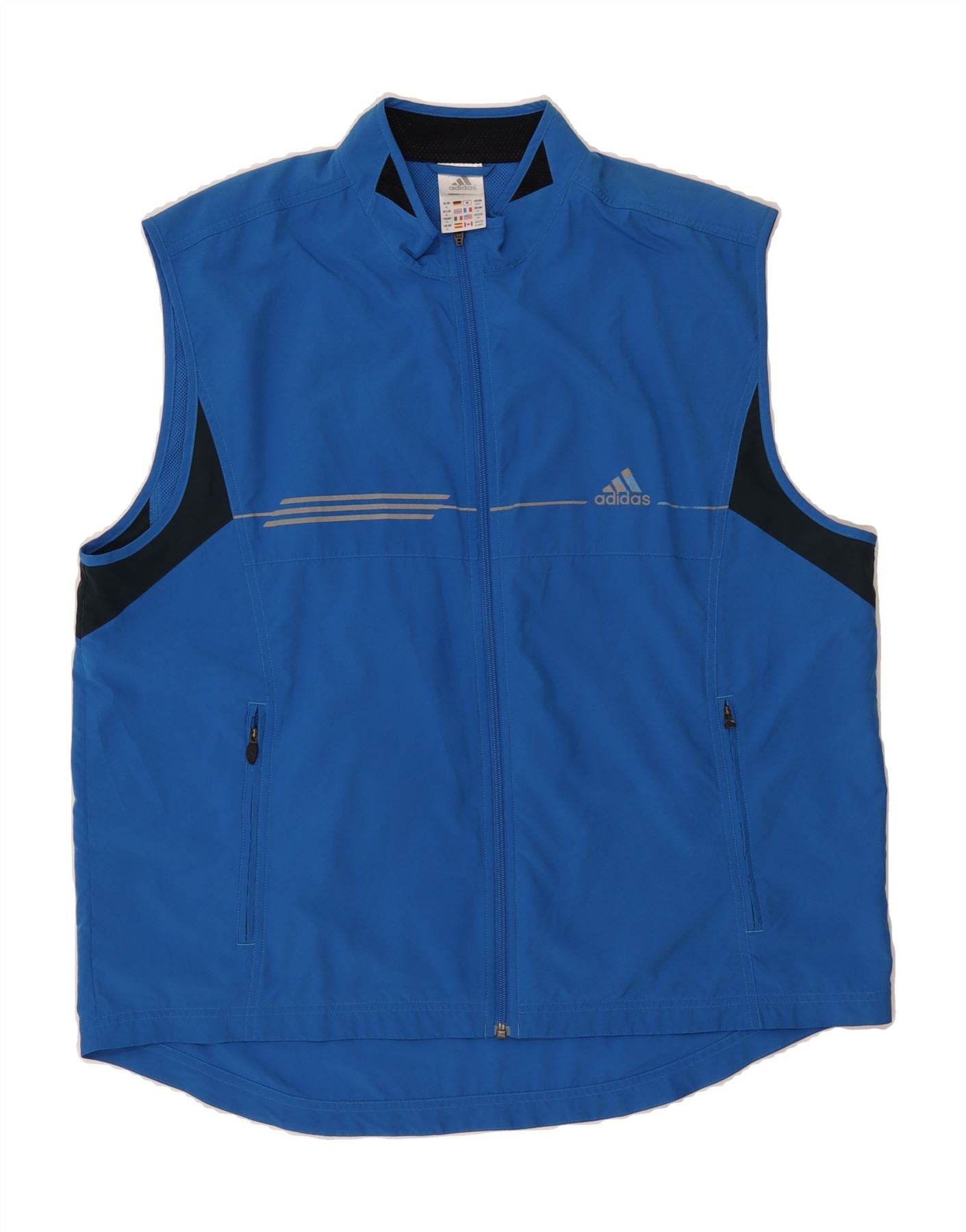 - AI Description: This pre-owned Adidas sports waistcoat is perfect for training. Constructed from lightweight, woven polyester, this sleeveless blue vest features a full zip closure and round neck. The regular fit ensures comfort, while zipped pockets offer secure storage. Reflective elements enhance visibility. Adorned with the iconic Adidas logo, this size XL waistcoat is machine washable and was made in Vietnam.