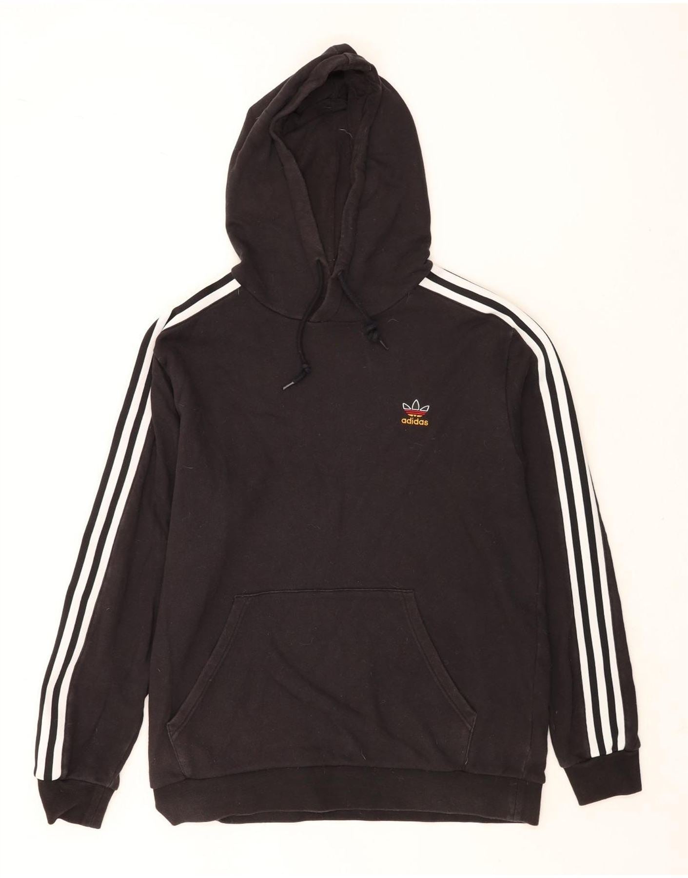 - Описание ИИ: Мужской джемпер с капюшоном Adidas выполнен из удобного черного хлопкового флиса. Пуловер классического дизайна с практичным капюшоном и кулиской. Длинные рукава украшены культовыми белыми полосами, ведущими к ребристым манжетам. На груди вышит небольшой красочный логотип Adidas Originals. Классический крой и передний карман-кенгуру сочетают стиль и функциональность.