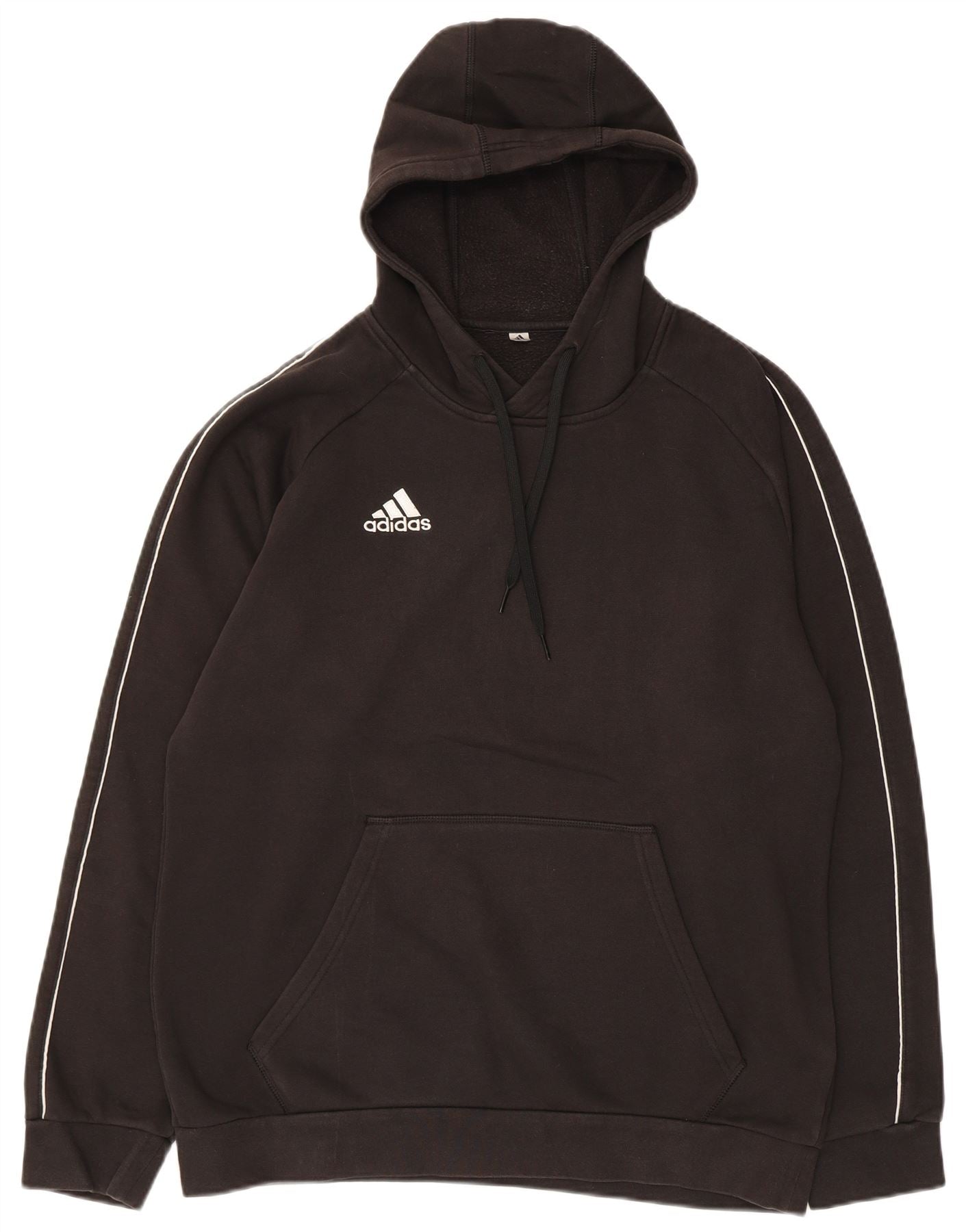 - Описание ИИ: Мужской джемпер с капюшоном Adidas выполнен из мягкого хлопкового трикотажа черного цвета. Имеет удобный вырез с капюшоном и длинные рукава с ребристыми манжетами. Модель пуловера идеально подходит для повседневной носки. Вдоль рукавов проходит заметная белая окантовка, дополняющая культовый логотип Adidas на груди. Практичный карман-кенгуру дополняет классический спортивный стиль.