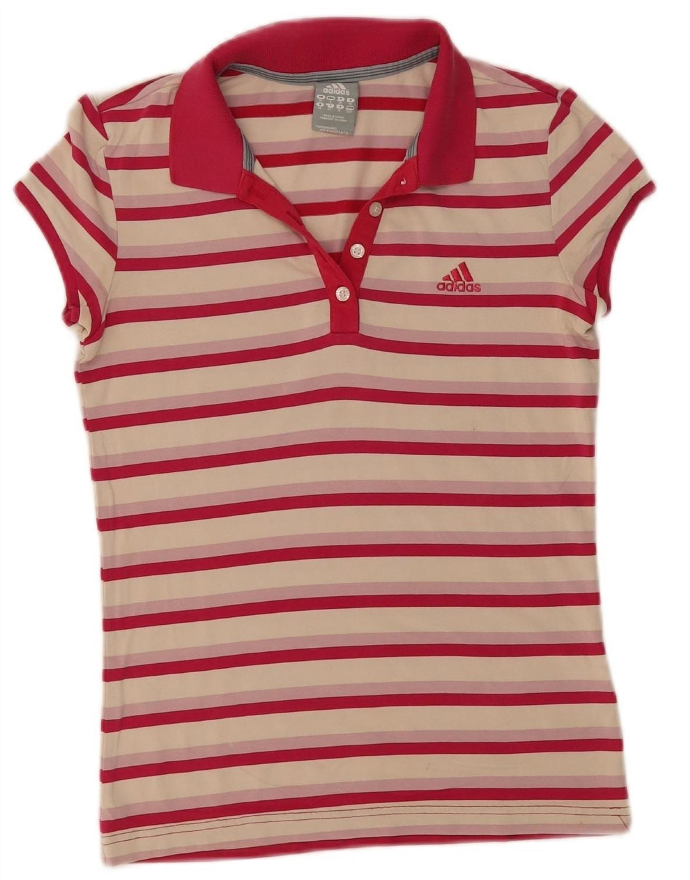 - AI Description: This Adidas women's shirt is crafted from a soft knit fabric, offering exceptional comfort. It features a vibrant striped pattern in multicoloured hues, including red, off white, and beige. The shirt presents a classic collared neckline and practical short sleeves. A neat button-up front provides a clean closure. Designed with a regular fit, it ensures ease of movement. A subtle Adidas logo adds a signature athletic accent. This versatile shirt is perfect for sports or everyday casual wear.