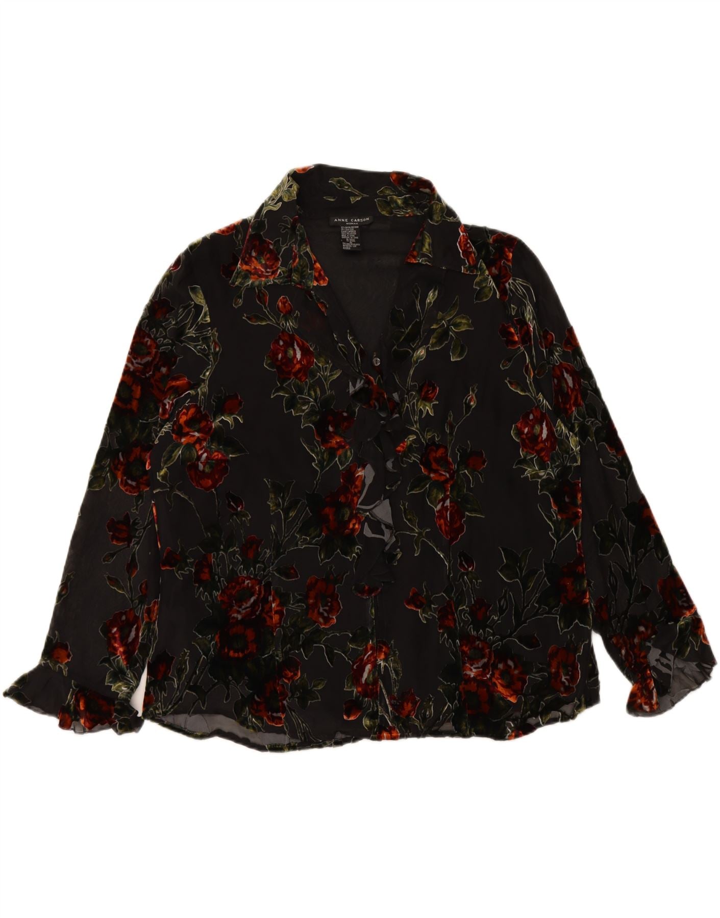 ANNE CARSON Womens Ruffle Front Shirt Blouse UK 20 2XL Black Floral Rayon