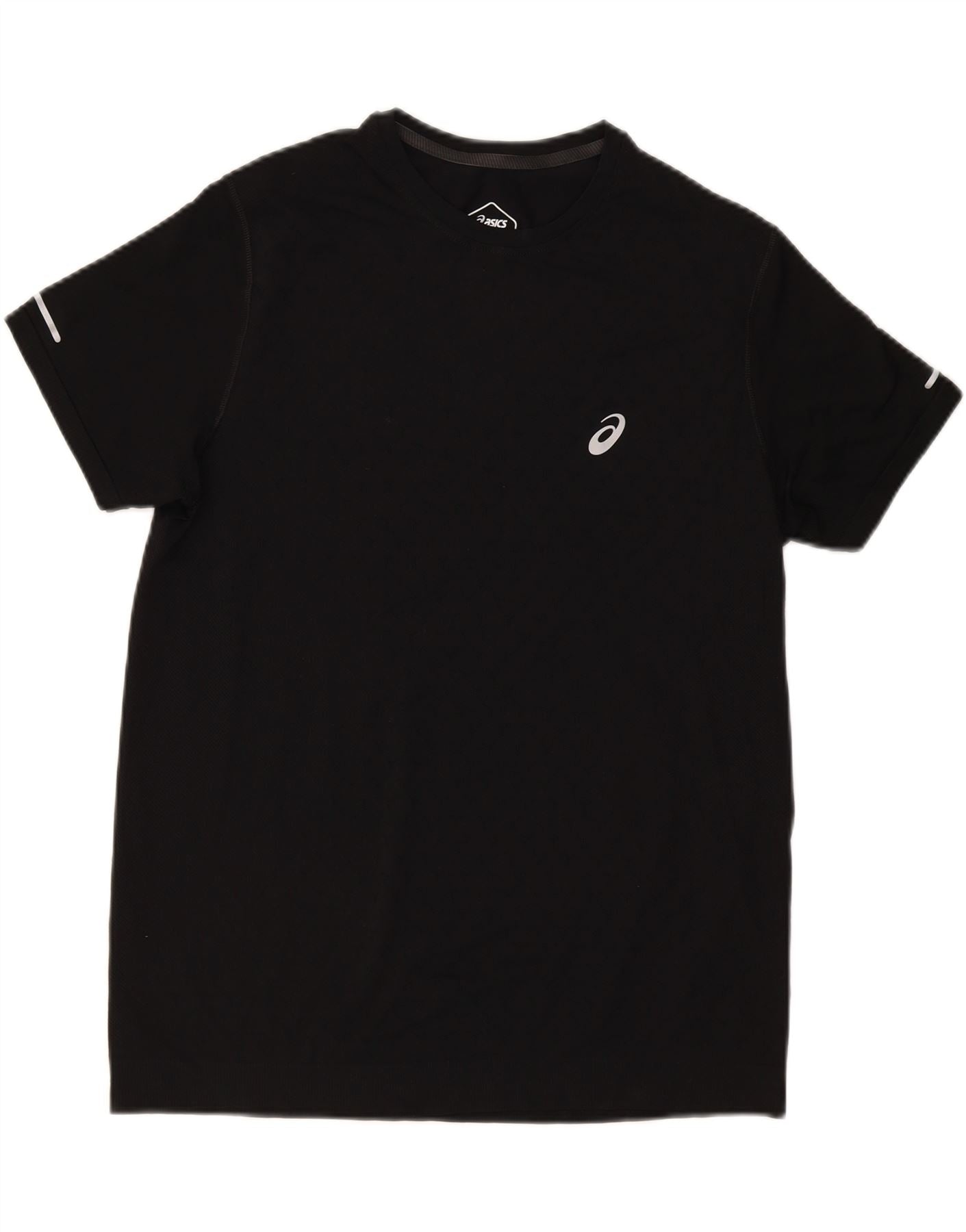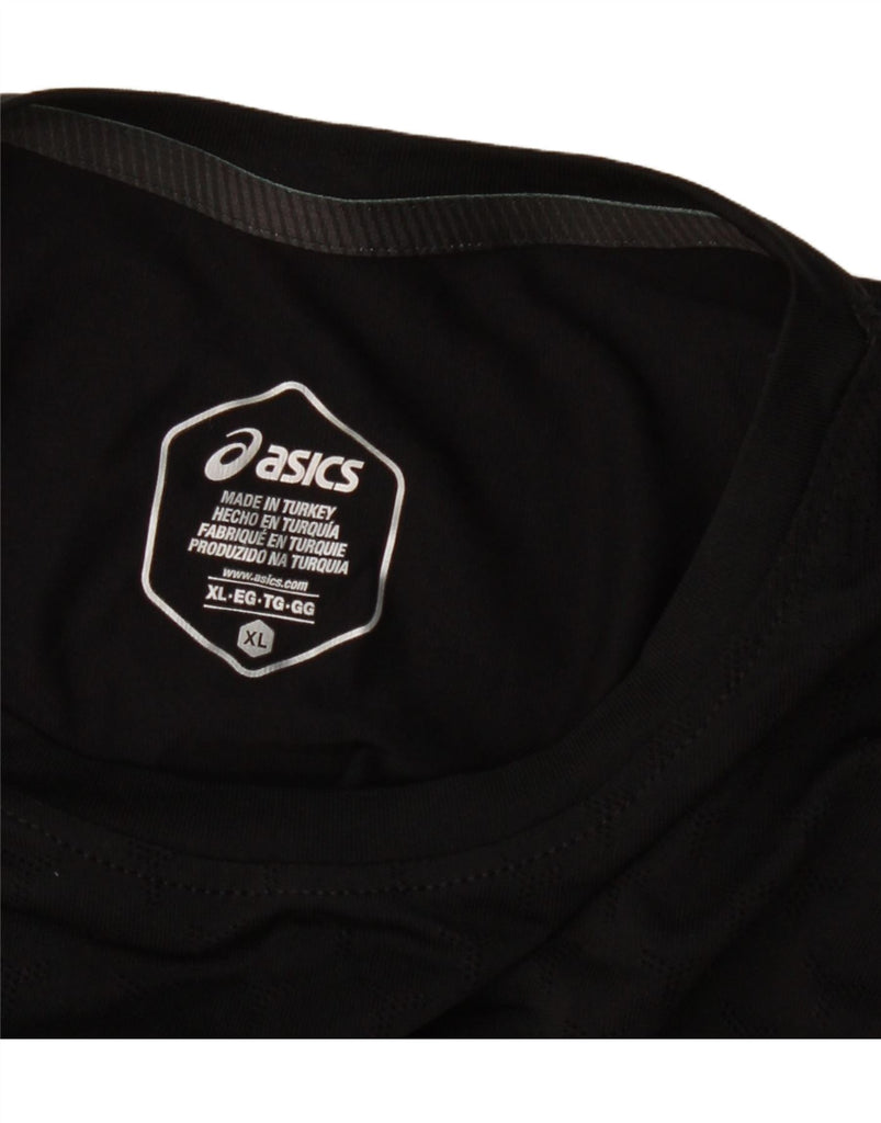 - AI Description: This Asics mens T-shirt is crafted from lightweight black jersey fabric. It offers a regular fit for comfortable movement during running. The round neck and short sleeves provide a classic silhouette. A graphic logo detail adds a sporty touch. This breathable top features reflective elements for enhanced visibility. Its pullover design ensures ease of wear.