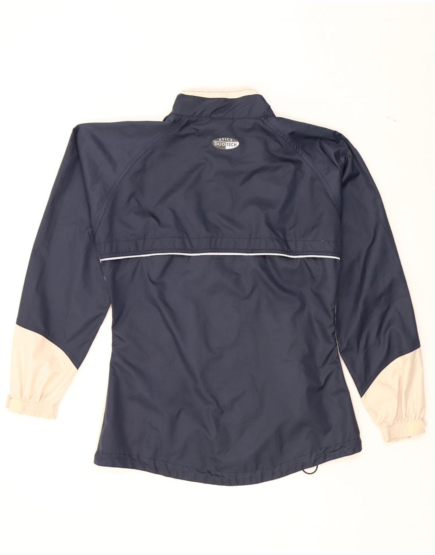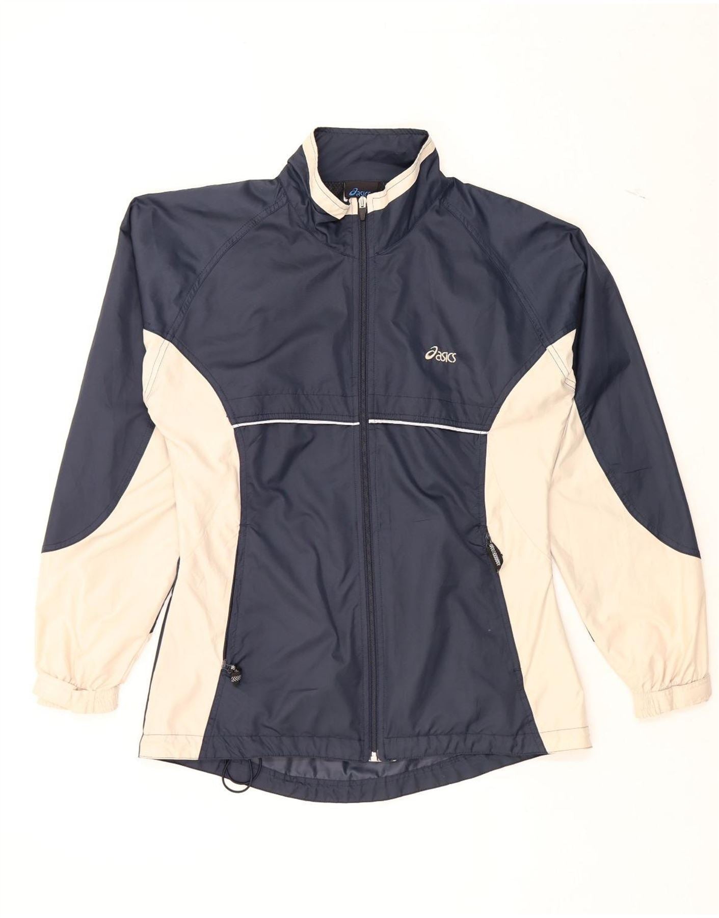 - AI Description: This pre-owned Asics windbreaker jacket is perfect for sports and outdoor activities. Crafted in Turkey from 100% polyester, its woven fabric offers water resistance and lightweight comfort. The navy blue jacket features a full zip closure, long sleeves, collared neckline, and a regular fit. Accented with a logo, it includes practical pockets. In excellent condition, it presents minor visible wear on the collar and some loose stitching on a seam. Size XS.