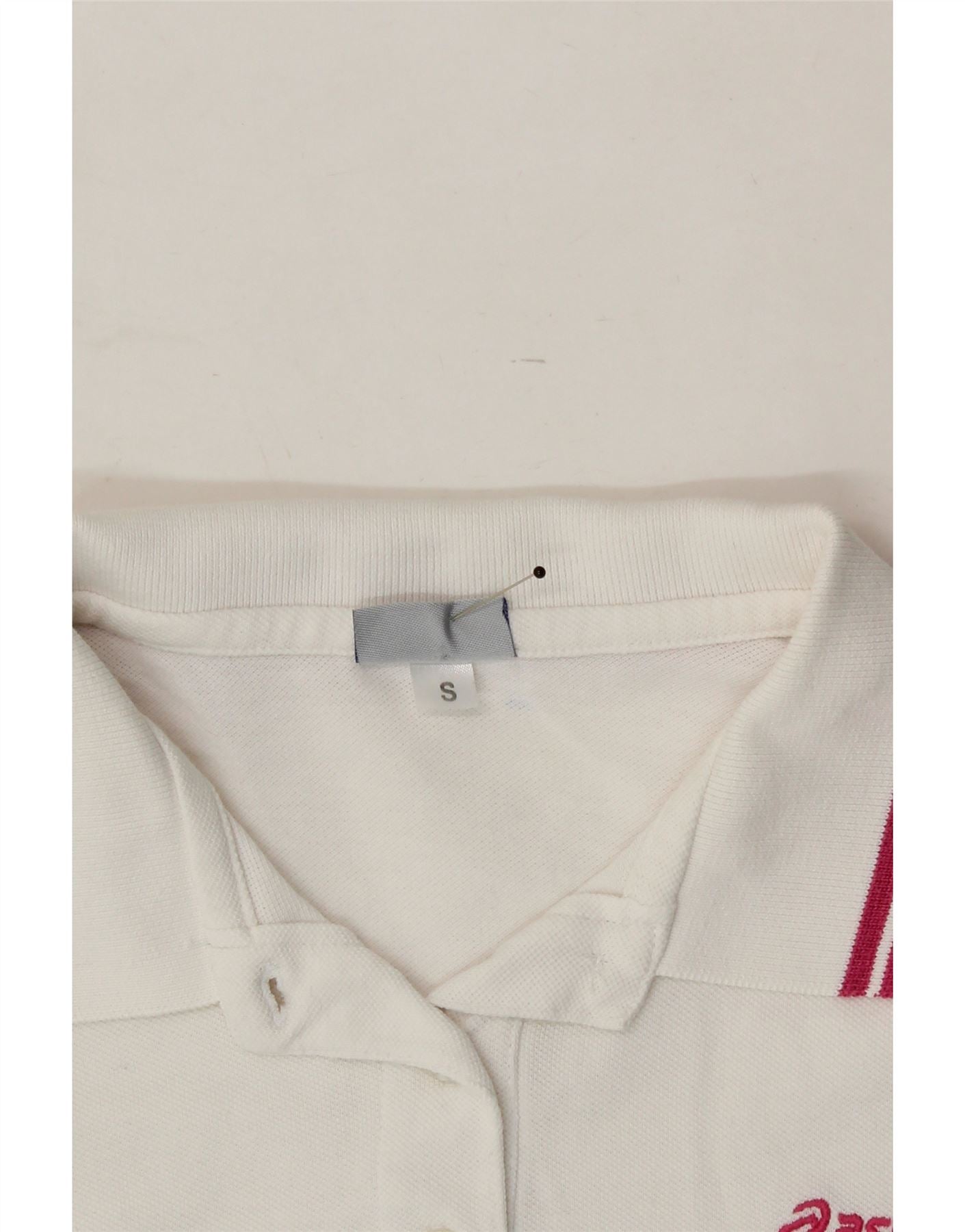 - AI Description: This pre-owned Asics T-shirt top is in excellent condition, showing only minor visible wear. Crafted from jersey fabric, it features a classic regular fit, short sleeves and a collared neckline. The white T-shirt features a logo accent and button closure. Ideal for sports or casual wear, this top also boasts graphic features and embroidered accents. Label size S.