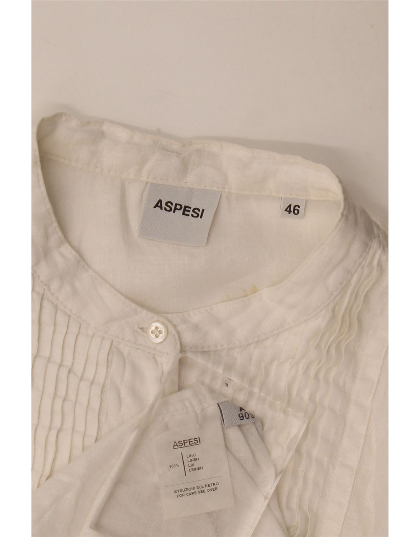 - Описание ИИ: Эта женская блузка-топ Aspesi изготовлена из 100% белого льна. Имеет вырез с воротником-стойкой и длинные рукава. Передняя часть украшена элегантными складками и застежкой на пуговицы. Регулярная посадка обеспечивает удобство ношения и классический силуэт. Это изделие отличается изысканной, но непринужденной эстетикой и идеально подходит для универсального стиля.
