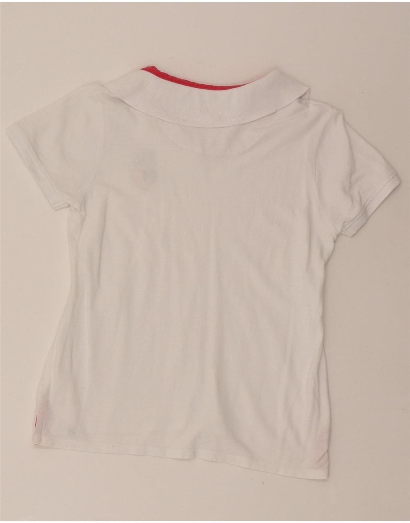- AI Description: This Avirex women's polo shirt, crafted from 100% cotton knit fabric, offers a comfortable regular fit ideal for everyday wear. Featuring a classic off-white colour with striking red trim and an embroidered USA heart logo, it combines casual style with subtle patriotic flair. The short sleeves and V-neckline enhance its relaxed yet polished look. Please note minor staining near the front lower hem, consistent with pre-owned condition. A versatile addition to any wardrobe, this shirt pairs effortlessly with jeans or skirts for a timeless, laid-back ensemble.