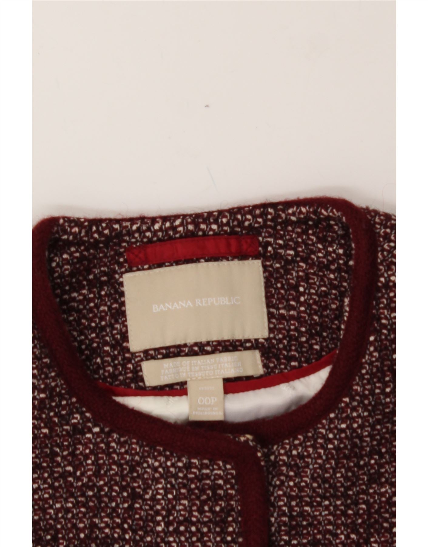 - AI Description: This pre-owned Banana Republic blazer jacket is a classic piece in burgundy tweed. Featuring a round neck and long sleeves, this lined jacket has a regular fit and button closure. Accented with buttons and pockets, this stylish jacket is labelled size 00P. In excellent condition.
