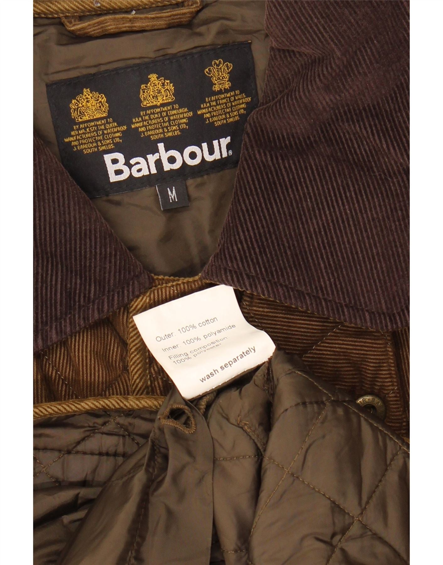 - AI Description: This Barbour mens quilted jacket is crafted from woven cotton with a rich brown finish. It features a distinctive quilted texture and a classic corduroy collar. The classic fit offers comfortable wear. A collared neckline and button-front closure provide a traditional silhouette. Long sleeves and practical pockets enhance its utility. The jacket is fully lined for added warmth and comfort, embodying timeless British style.