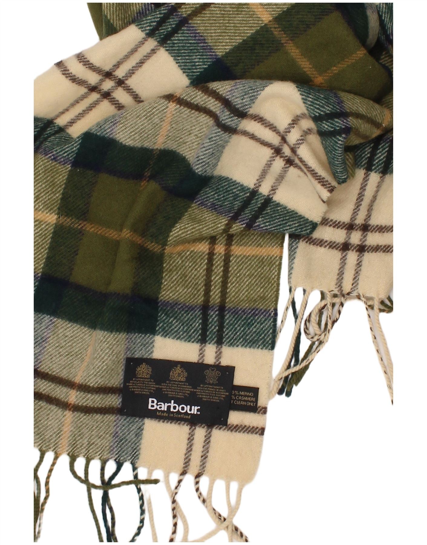 - AI Description: This Barbour womens rectangle scarf is crafted from luxurious 100 percent Merino wool. Its woven texture offers exceptional thermal comfort. A classic plaid pattern in multicoloured hues of off white, green, and brown defines its sophisticated look. The relaxed fit ensures versatile styling. Finished with elegant fringe detailing, it provides both warmth and a refined aesthetic.