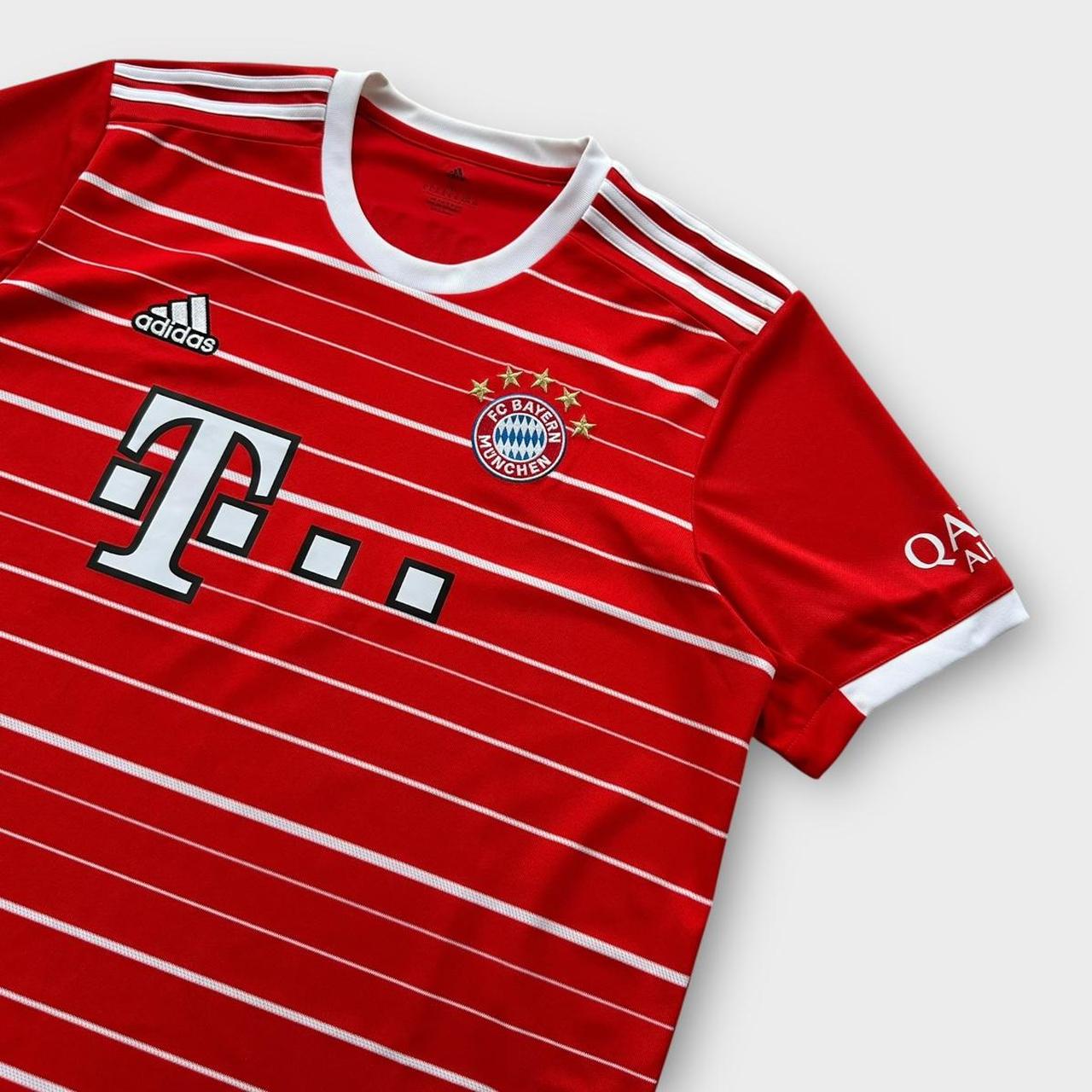 Домашняя футбольная футболка Баварии Мюнхен сезона 2022/2023 от Adidas с вышитыми логотипами и спонсором T-Mobile на груди. На спине указано имя игрока «Musiala 42».