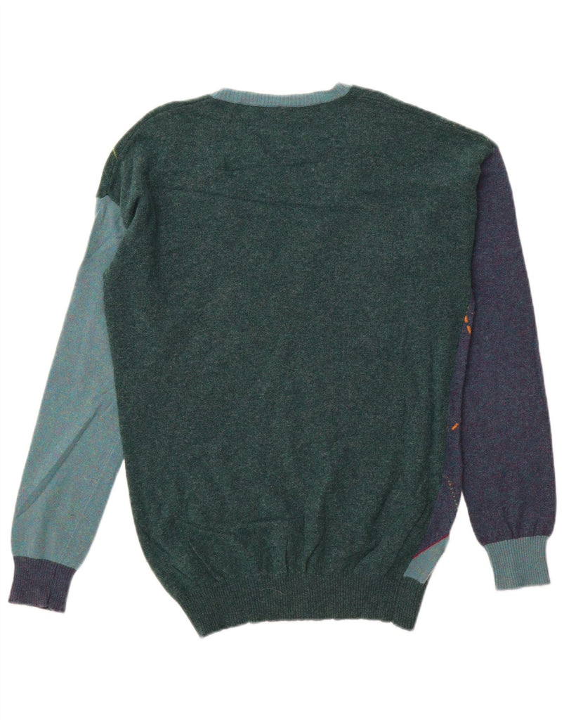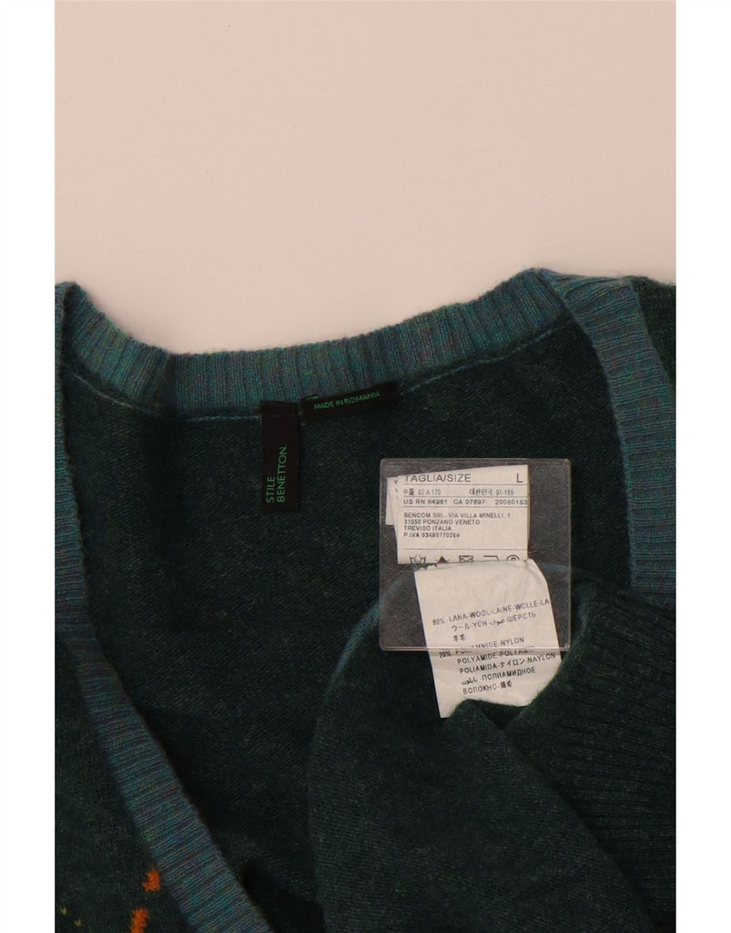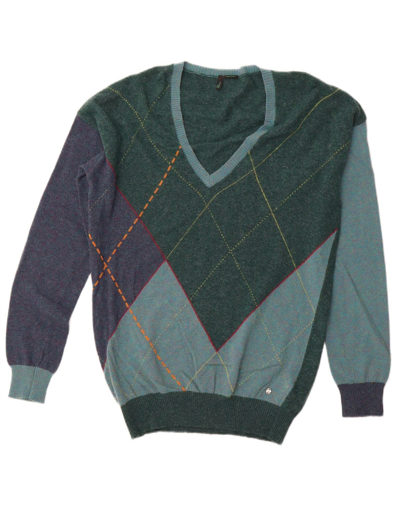 BENETTON Mens V-Neck Jumper Sweater Large Green Argyle/Diamond Wool