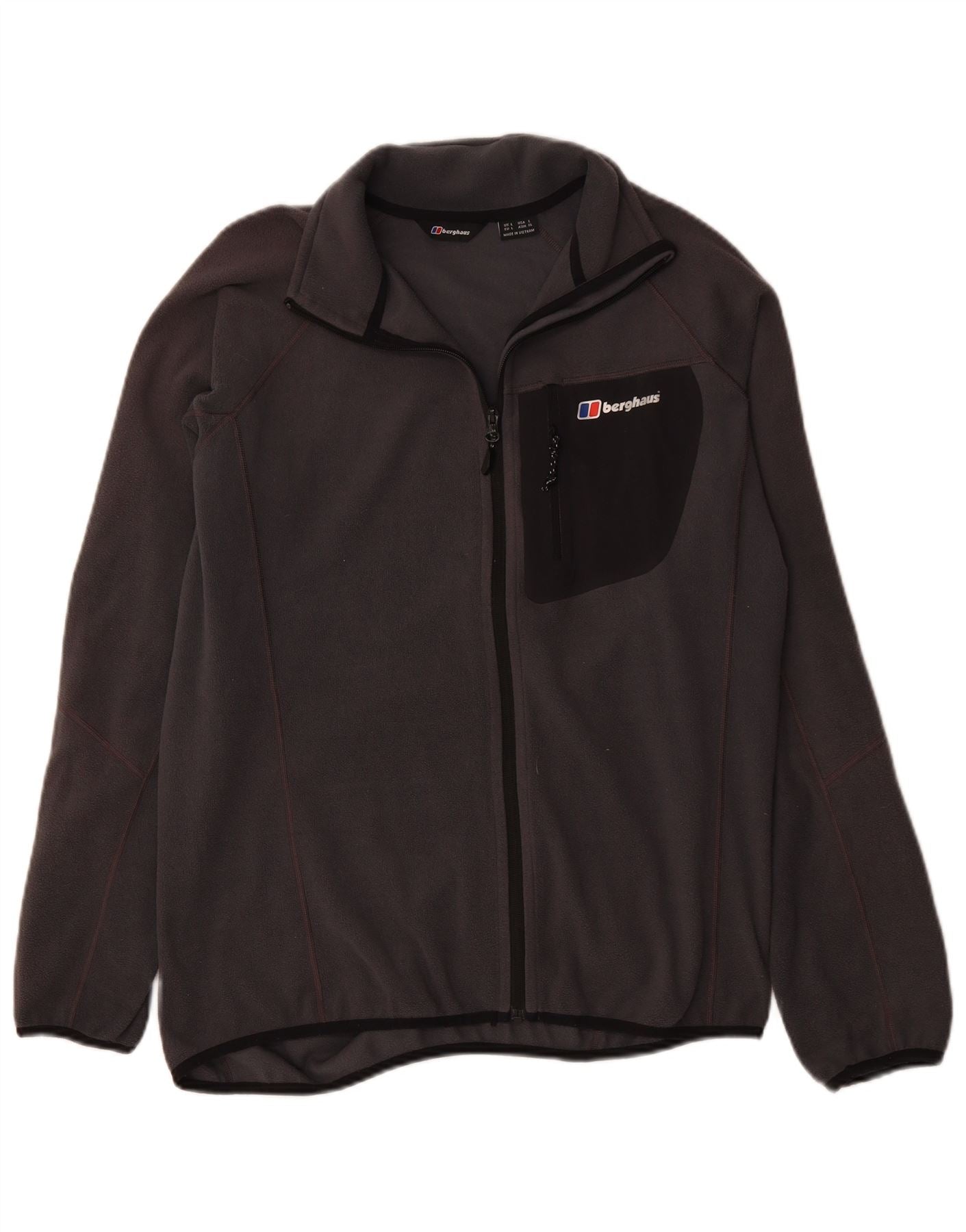 - AI Description: This Berghaus mens fleece jacket is crafted from soft grey fleece fabric. It features a collared neckline and long sleeves. The full zip closure extends to the neck. A regular fit ensures comfortable wear. Zipped pockets offer practical storage. Its lightweight design makes it ideal for sports and outdoor activities.