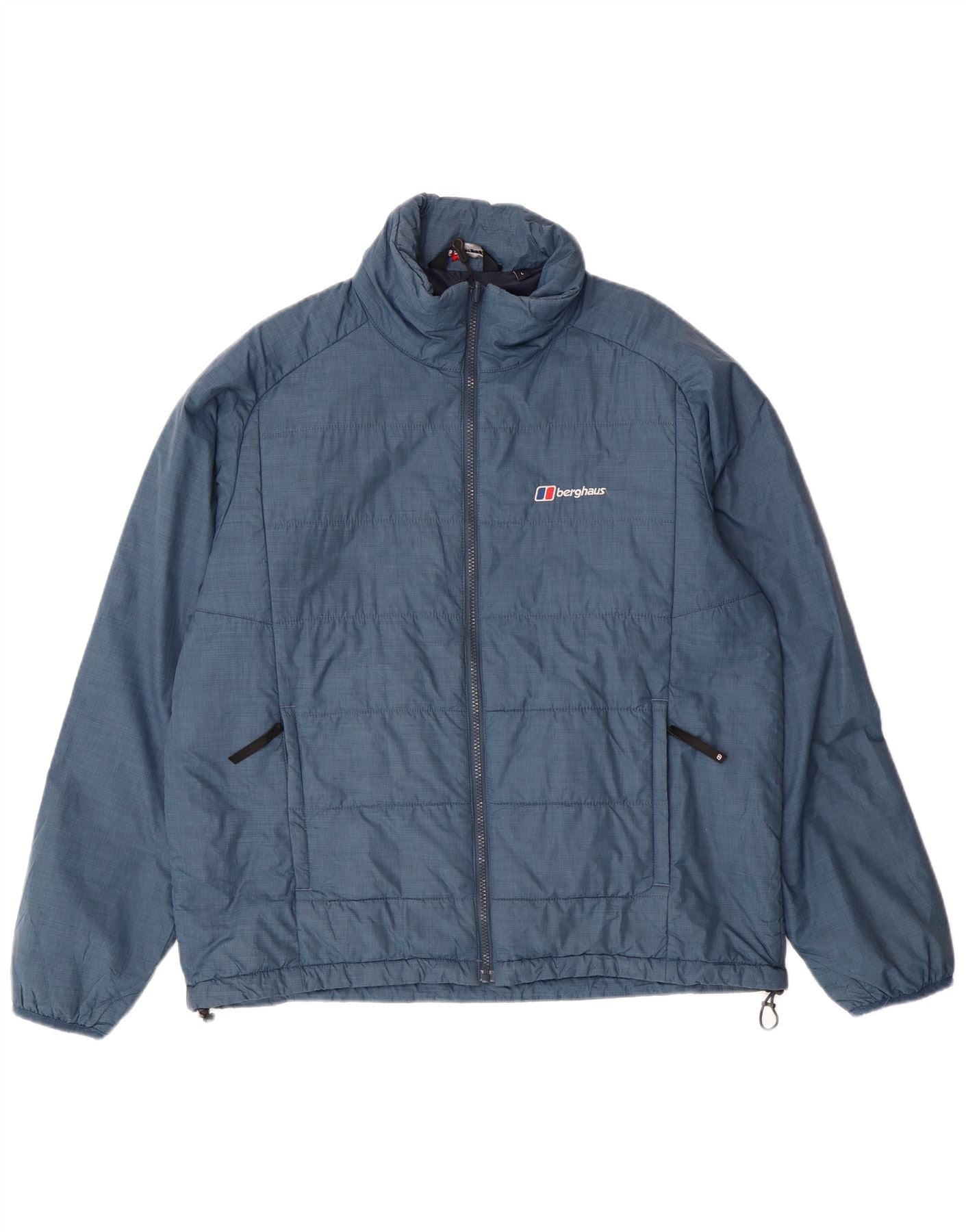 - AI Description: This Berghaus men's Padded Jacket is crafted from durable blue nylon, offering a padded and woven texture. It features a collared neckline and long sleeves. The full zip closure ensures practicality, complemented by zipped pockets for secure storage. A regular fit ensures comfort and ease of movement. The design is completed with a subtle brand logo accent.