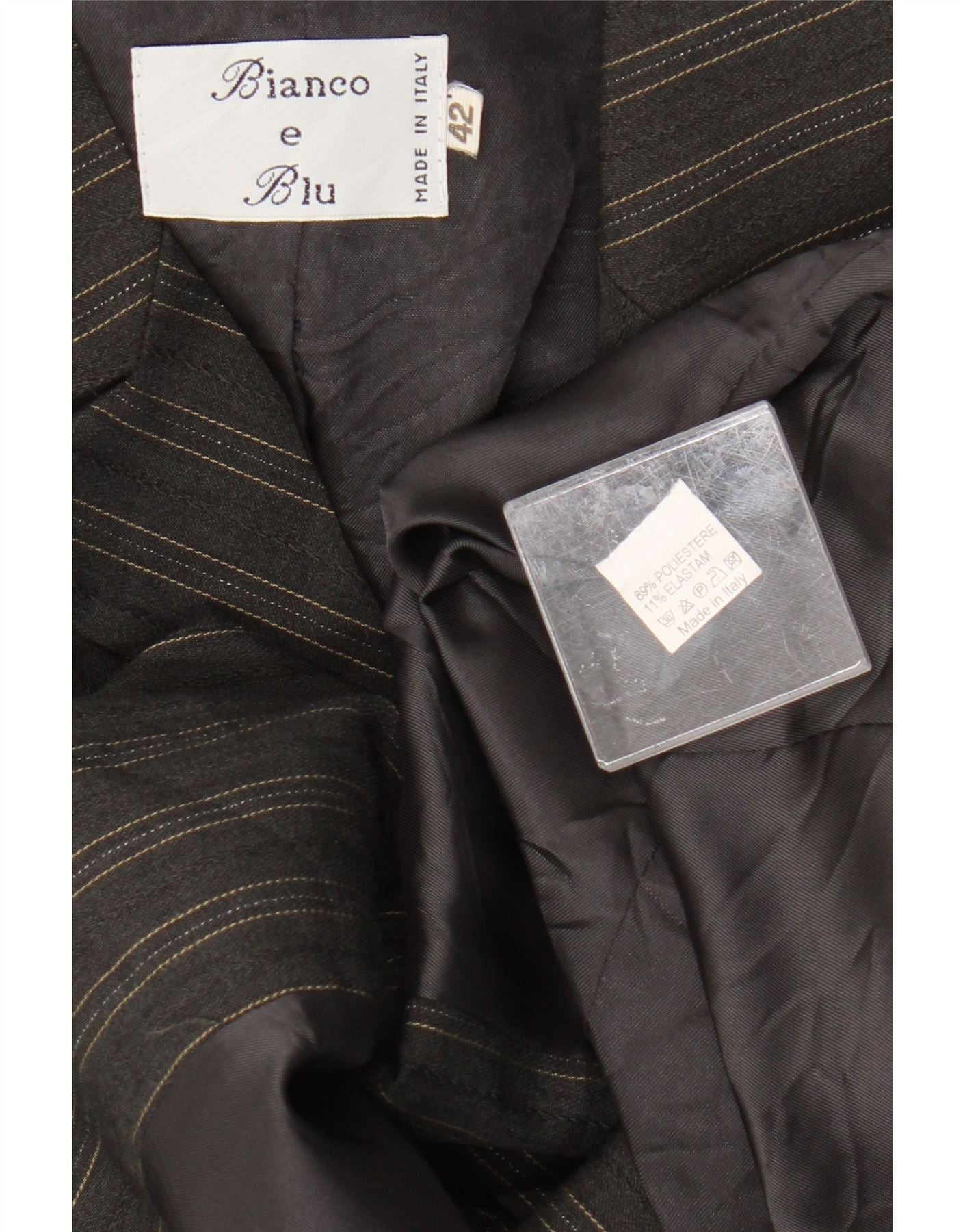 - Описание ИИ: Женский пиджак Bianco E Blu выполнен из черной полиэфирной ткани с тонким узором в тонкую полоску. Имеет классический вырез горловины и застежку на пуговицы спереди. Длинные рукава и классический крой создают элегантный, индивидуальный силуэт. Куртка полностью на подкладке и имеет практичные карманы, сочетающие классический стиль с функциональным дизайном.