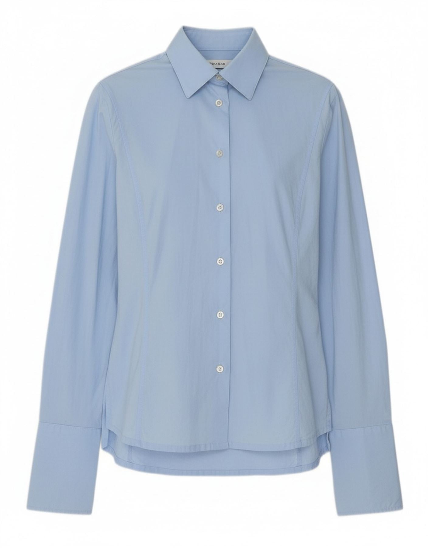 - AI Description: This Bikkembergs women's formal shirt is crafted from a blue cotton blend with a touch of elastane for stretch. Its tailored, slim fit creates a sleek silhouette. The classic collared neckline and full button-up front offer a refined look. Long sleeves finish with neat buttoned cuffs, enhancing the smart appeal. This shirt provides both comfort and a polished finish, ideal for professional wear.