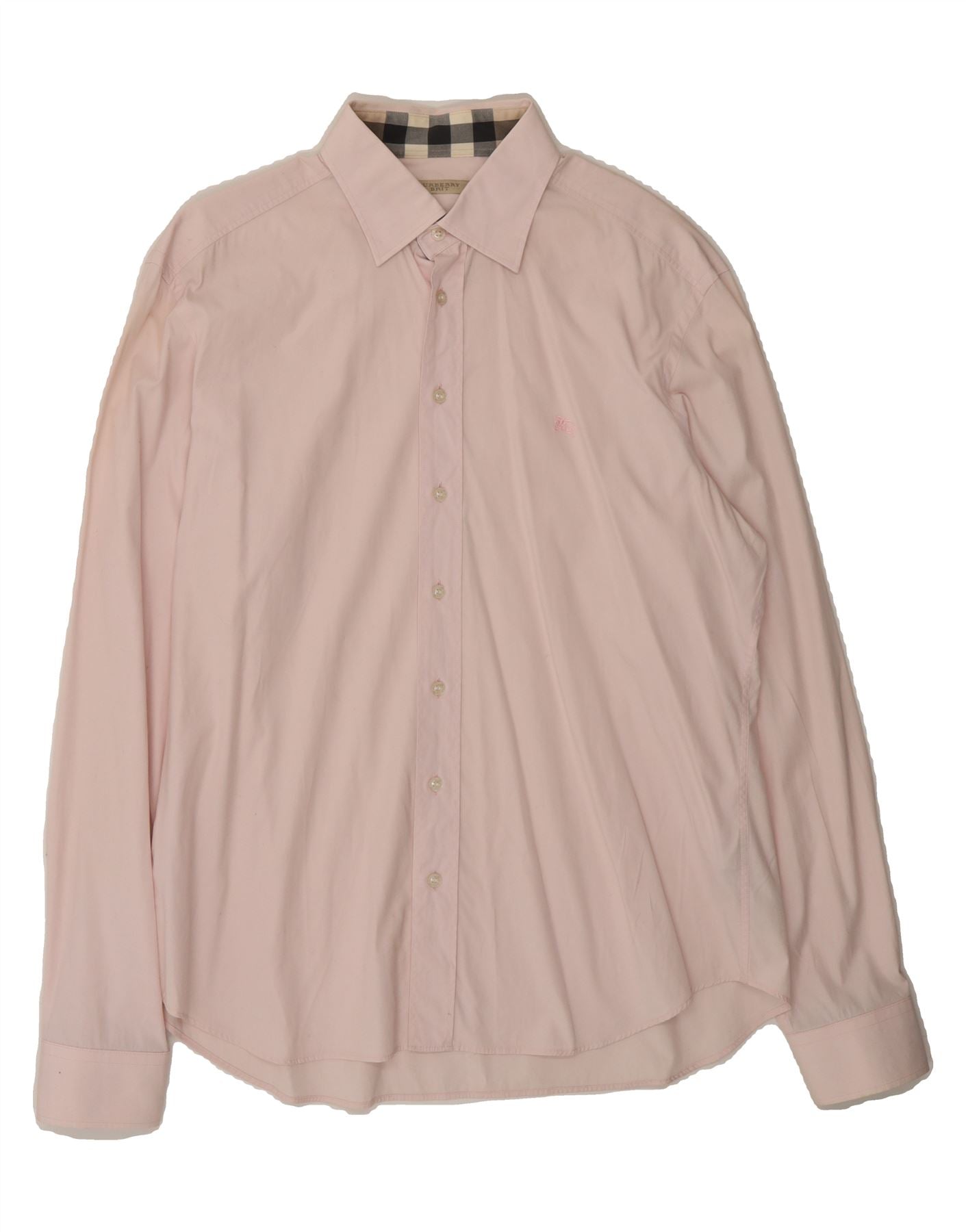 - AI Description: This is a pre-owned Burberry men's shirt, size XL, crafted from a comfortable blend of 97% cotton and 3% elastane. The classic, long-sleeved shirt features a collared neckline and a regular fit. The pink, check pattern adds a touch of timeless style. The shirt presents with some minor signs of wear, including minor discoloration and stains to the front, moderate discoloration to the back and minor wear to the collar. Garment has been well maintained, is machine washable and can be tumble dried on a low setting.