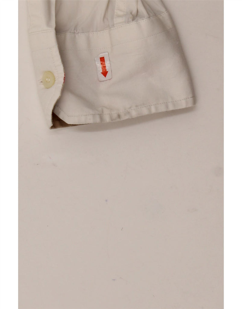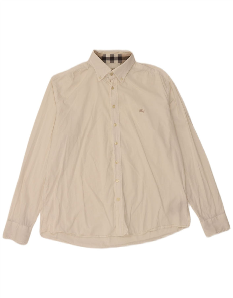 - AI Description: This Burberry Brit mens shirt is crafted from a woven off white cotton blend. It features a classic collared neckline and long sleeves with cuffed detailing. The button up front ensures a neat closure. With a regular fit and added stretch, this shirt offers both comfort and a smart silhouette. A subtle logo accent completes the timeless design.
