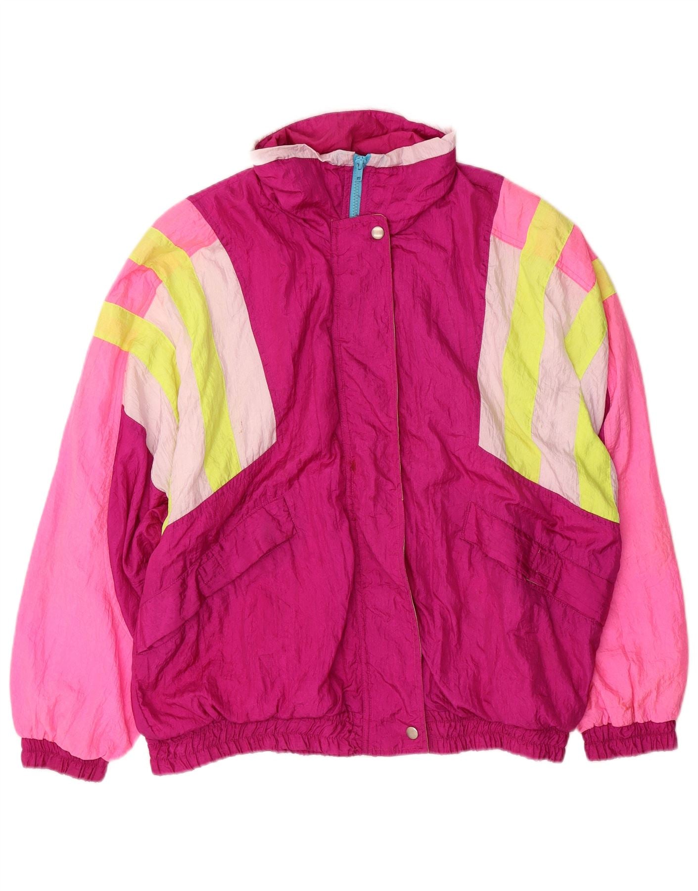 - AI Description: This C & A mens tracksuit top jacket is crafted from lightweight, windproof polyamide, offering a smooth woven texture. It features a collared neckline and long sleeves. The full zip closure ensures practicality. A regular fit provides comfortable wear. The vibrant colourblock pattern gives it a distinct 80s retro style. Practical pockets add functionality.