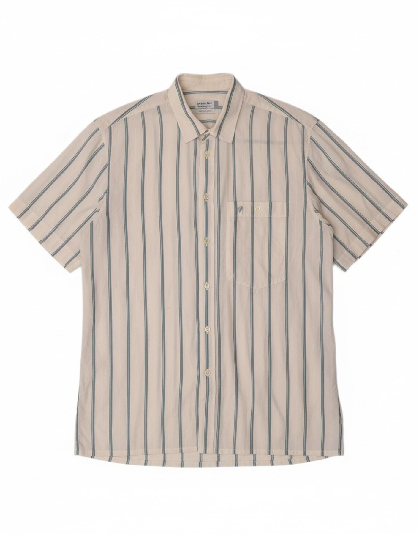 - AI Description: This Cacharel men’s shirt features an off-white woven fabric with a distinct striped pattern. The collared neckline and short sleeves offer a classic silhouette. A button-up front ensures a clean, traditional finish. Designed for a regular fit, it includes functional pockets for practicality. The geometrical stripes provide a subtle visual interest.