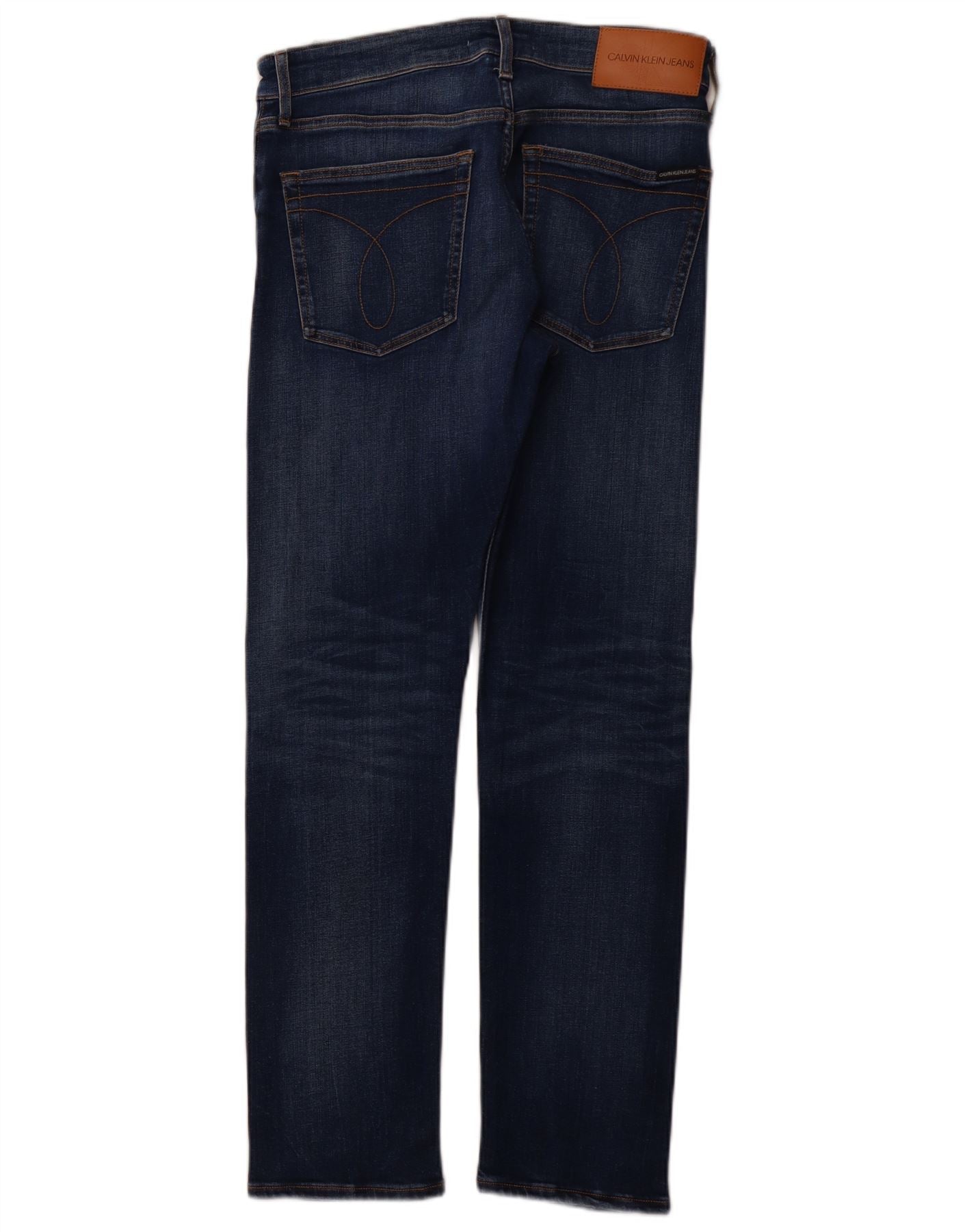 - AI Description: These Calvin Klein Jeans mens straight jeans are crafted from a blue blended fabric. The cotton-rich denim offers comfortable stretch and durability. They feature a classic straight leg and a regular fit for timeless appeal. A secure zip closure ensures a smooth front. Practical pockets are included, and a subtle logo accent adds signature branding. This classic style provides both comfort and a smart aesthetic for everyday wear.