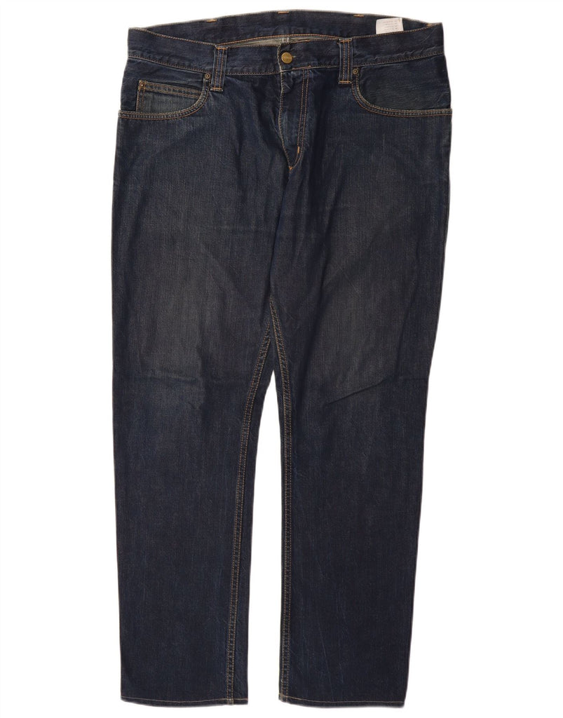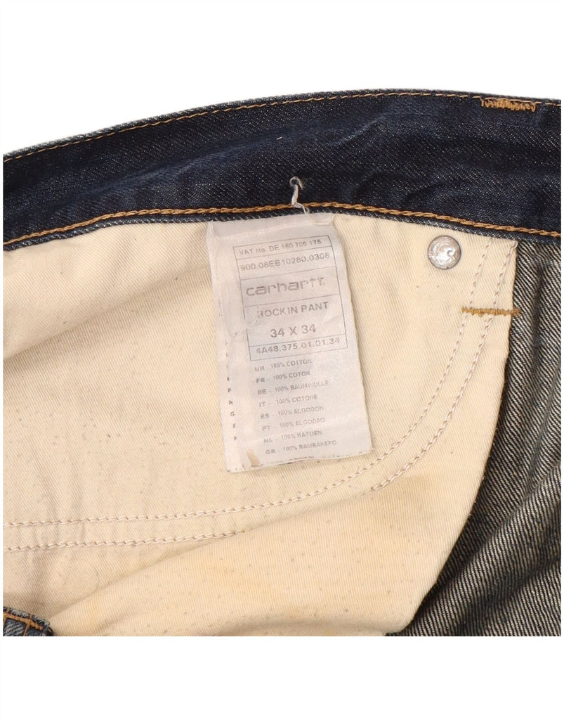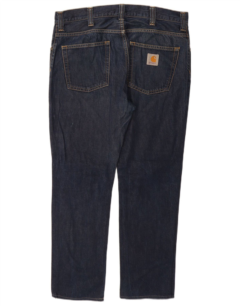 - AI Description: This Carhartt mens straight jeans are crafted from durable blue denim, made from 100 percent cotton. The fabric offers a robust yet comfortable feel. They feature a classic straight leg and a regular fit, ensuring ease of movement. A secure button closure fastens the front. Practical pockets provide functionality, complemented by a subtle brand logo accent.
