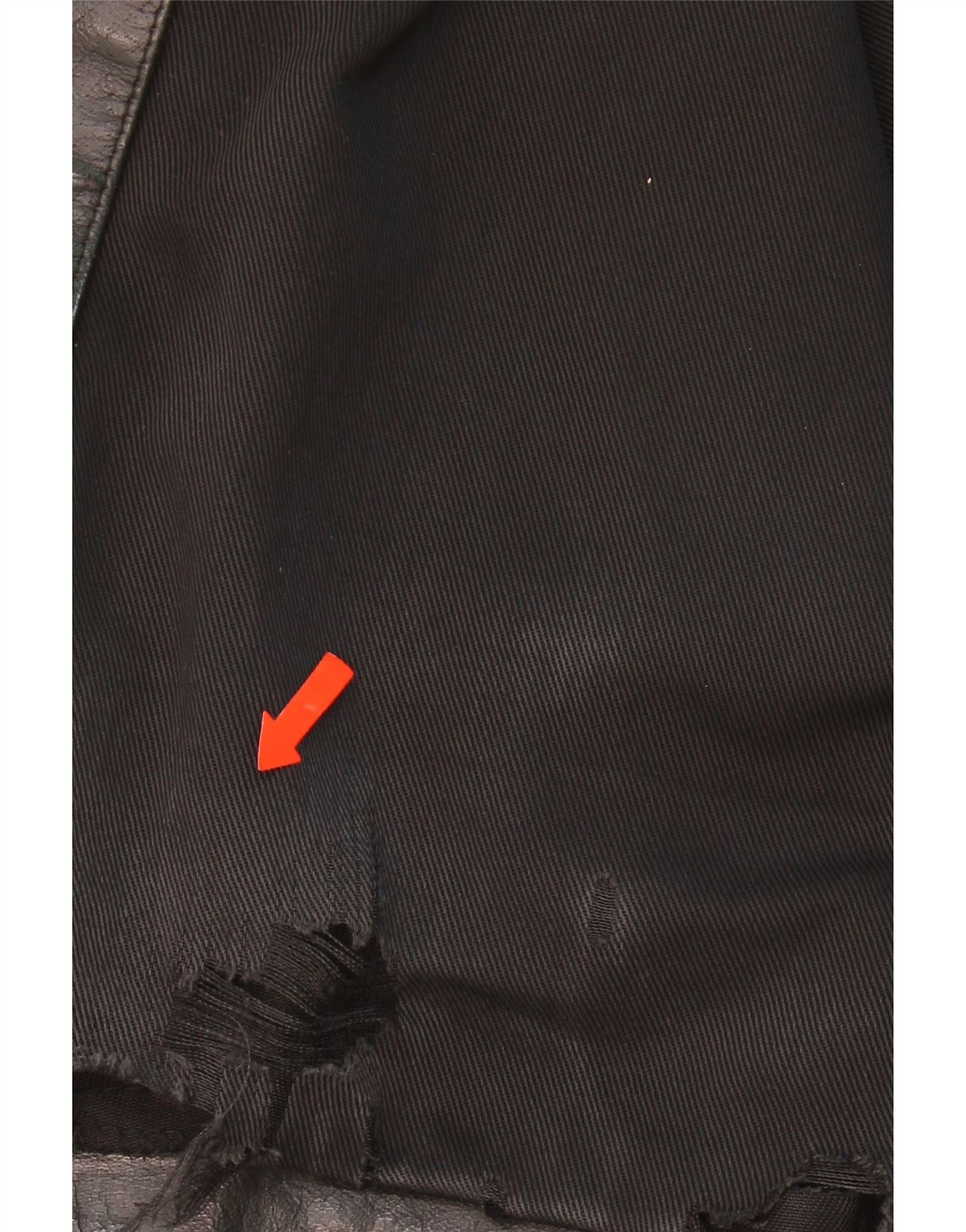 - AI Description: CAT black leather biker jacket in pre-owned, fair condition. Crafted from real leather, this men's jacket features a regular fit, long sleeves, and a collared neckline. The zip closure and zipped pockets add practicality. Accented with a logo and zip details, it's fully lined for comfort. Note: Minor holes/tears on the exterior near a button and moderate holes/tears in the lining near the hem. Label size L.