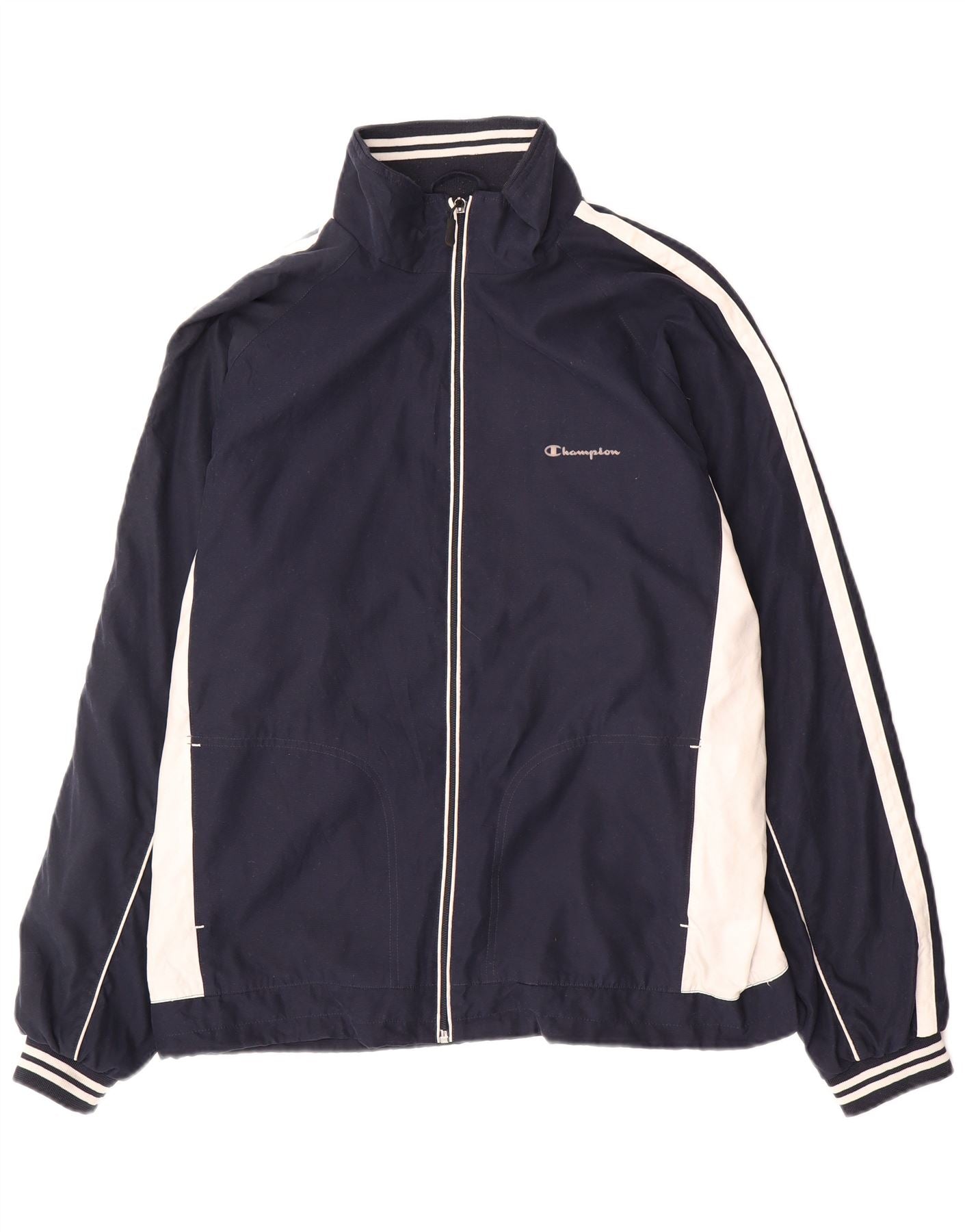 - Описание ИИ: Мужской спортивный пиджак Champion выполнен из гладкой ткани темно-синего цвета. Вырез горловины с воротником и застежка-молния по всей длине обеспечивают универсальность ношения. Длинные рукава заканчиваются эластичными манжетами. Дизайн колор-блок включает белые полосы вдоль рукавов и боковых вставок. На груди вышит изящный логотип Champion. В комплект входят практичные карманы. Он предлагает стандартную посадку для комфортного передвижения.
