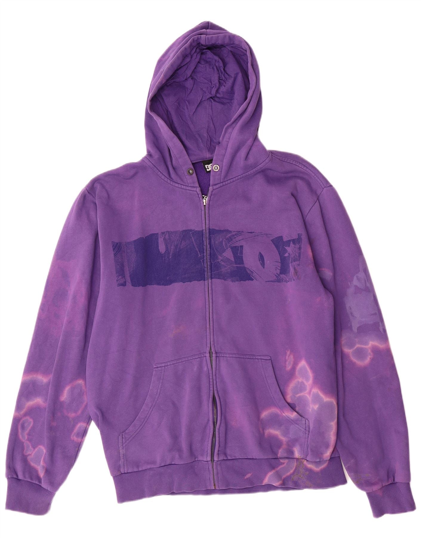 - AI Description: This DC mens zip hoodie sweater is crafted from soft fleece fabric with a unique purple acid wash finish. It features a full zip closure and a comfortable hooded design. Long sleeves and a regular fit ensure ease of wear. The tie dye pattern adds a retro skateboarding style. Practical pockets and a graphic logo complete the design.