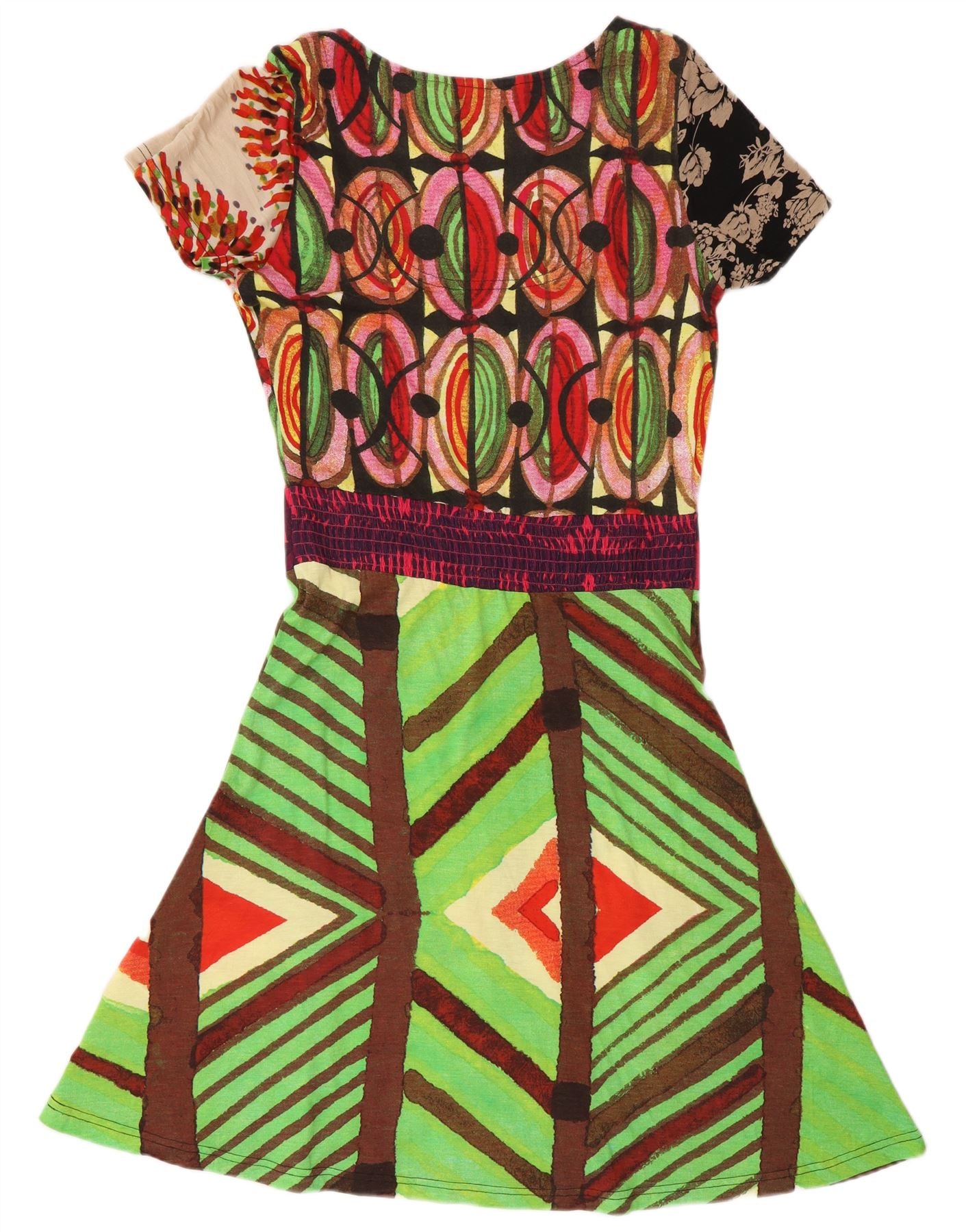 - Описание ИИ: Женское платье-футболка Desigual изготовлено из мягкой ткани из смеси вискозы и хлопка. Он украшен ярким разноцветным геометрическим узором, демонстрирующим сумасшедший художественный талант. Платье имеет классический круглый вырез и короткие рукава. Его стандартная посадка обеспечивает удобство ношения и имеет простой стиль пуловера. Отличительная деталь логотипа тонко подчеркивает дизайн. Эта красочная вещь сочетает в себе комфорт и смелый, уникальный стиль.