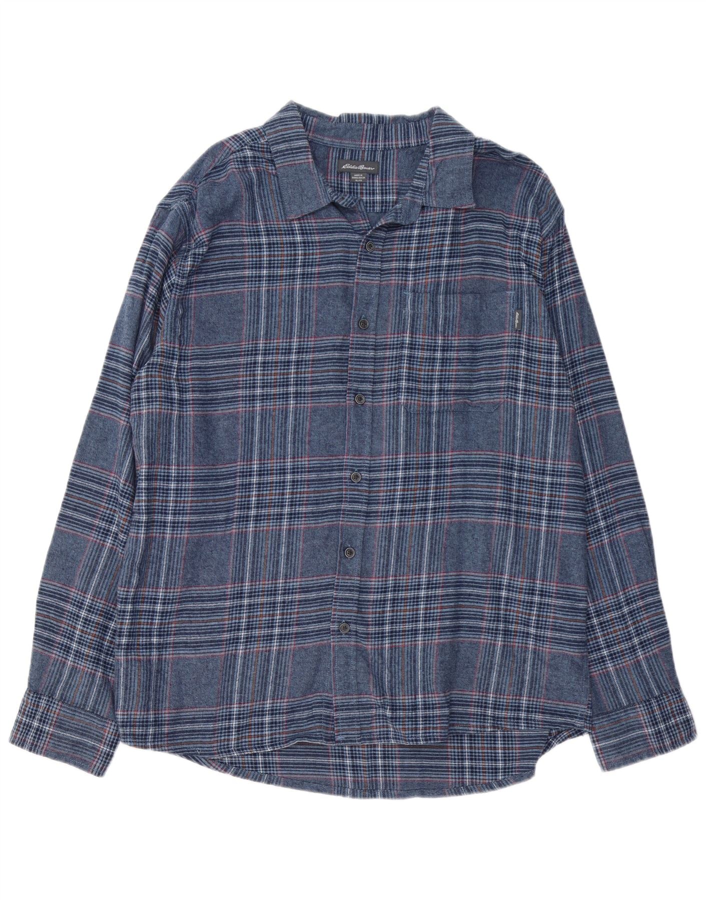 EDDIE BAUER Mens Flannel Shirt XL Blue Plaid Cotton