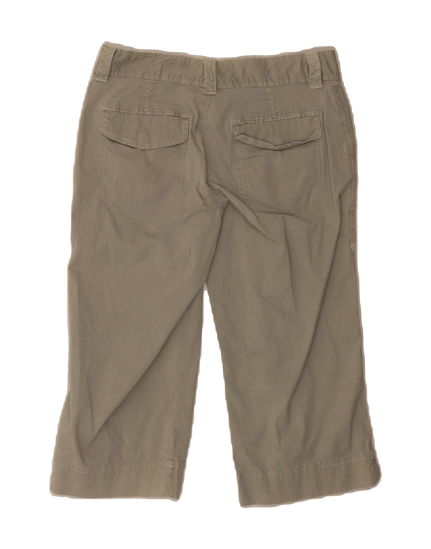 - AI Description: These pre-owned Eddie Bauer capri trousers are crafted from a comfortable 98% cotton, 2% spandex blend. In excellent condition, these grey, regular fit trousers feature a button closure and practical pockets. There are minor defects: some loose stitching on the pockets, and slight discoloration on the waistband. Label size 2. See side for care. Made in Sri Lanka.