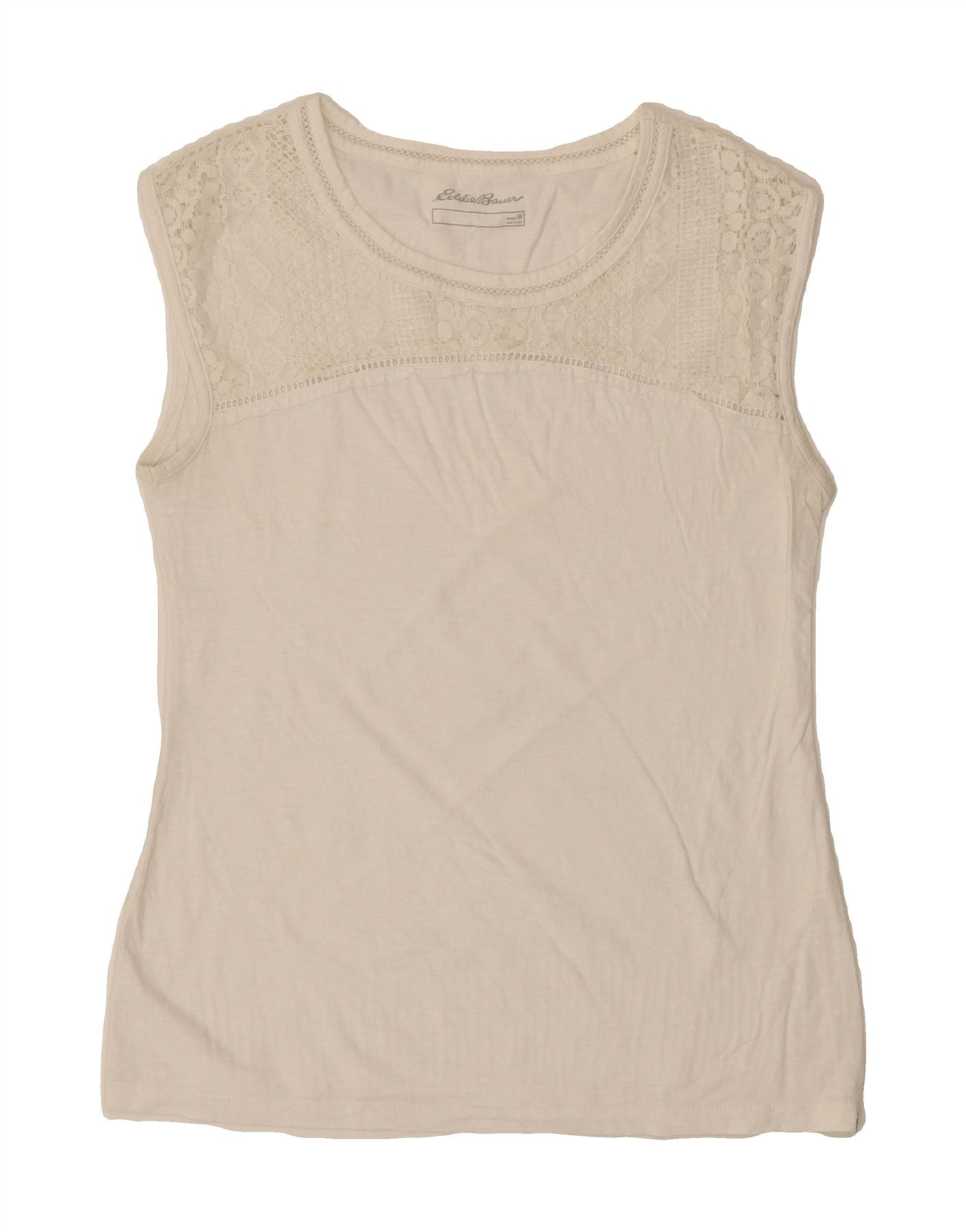 - AI Description: This pre-owned Eddie Bauer women's T-shirt top is a classic, sleeveless design in white, featuring a round neckline and a pullover closure. The knit fabric offers a regular fit, accentuated with delicate lace detailing. While labelled as size M and made in India, this garment presents moderate stains on the front. Ideal for casual wear, this T-shirt top is perfect for layering or enjoying on its own.