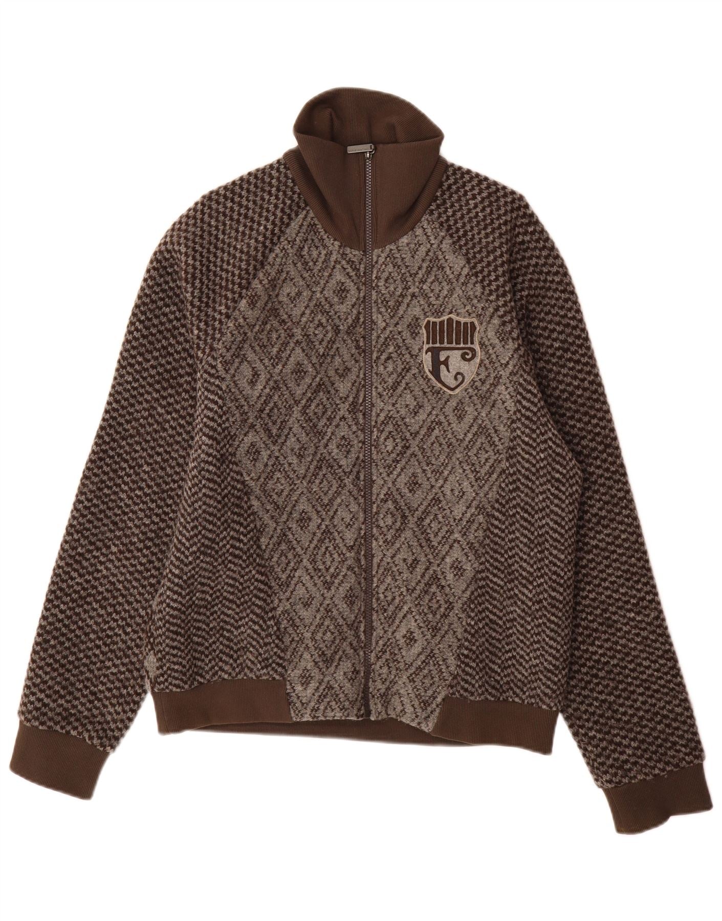 ENERGIE Mens Graphic Cardigan Sweater Large Brown Geometric Wool