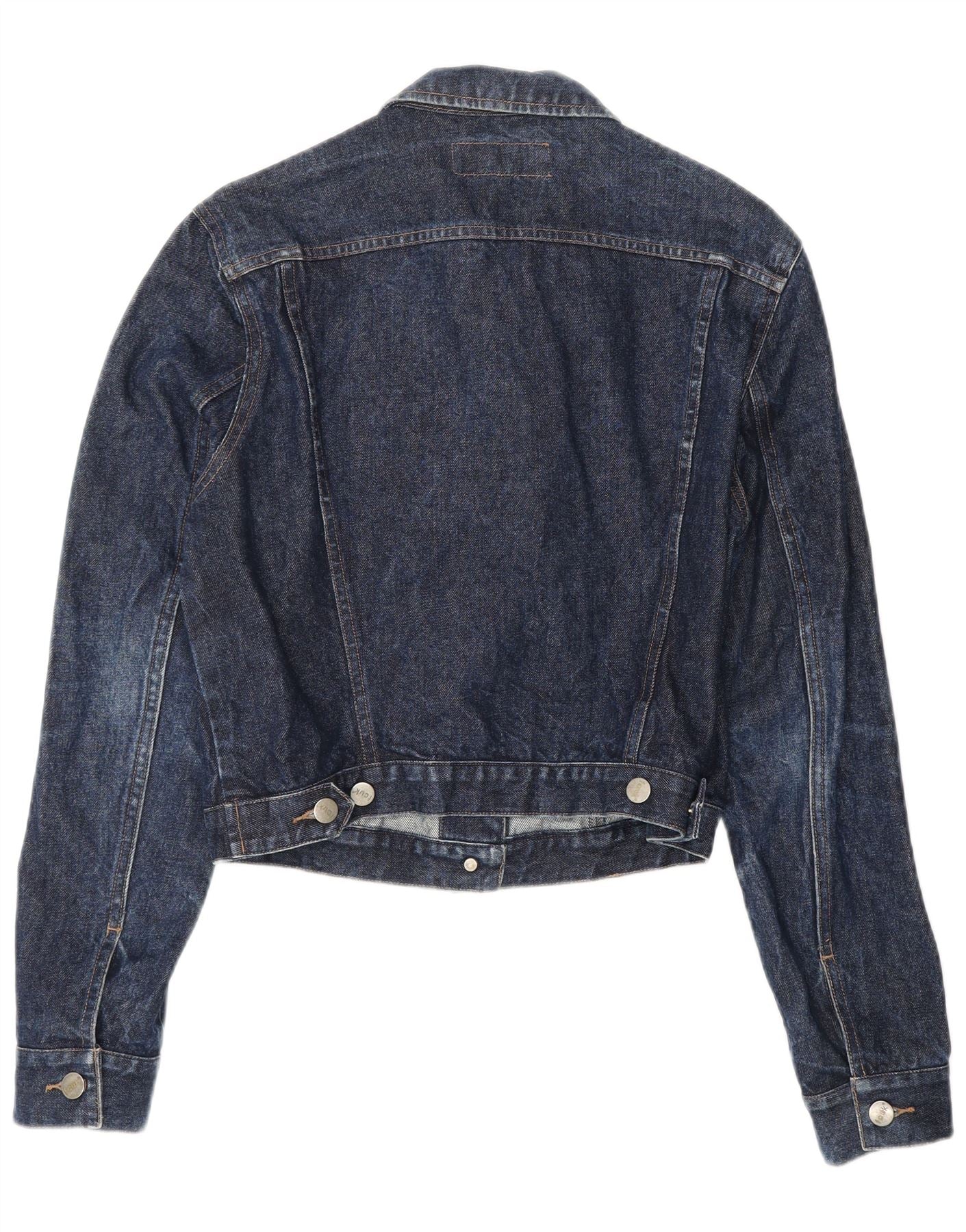 - AI Description: This Fcuk womens denim jacket is crafted from durable 100 percent cotton denim in a rich navy blue. It features a classic collared neckline and long sleeves. The front is secured with a five button closure, complemented by button accents. Practical pockets add functionality. A regular fit ensures comfortable wear and a timeless silhouette, perfect for versatile layering.