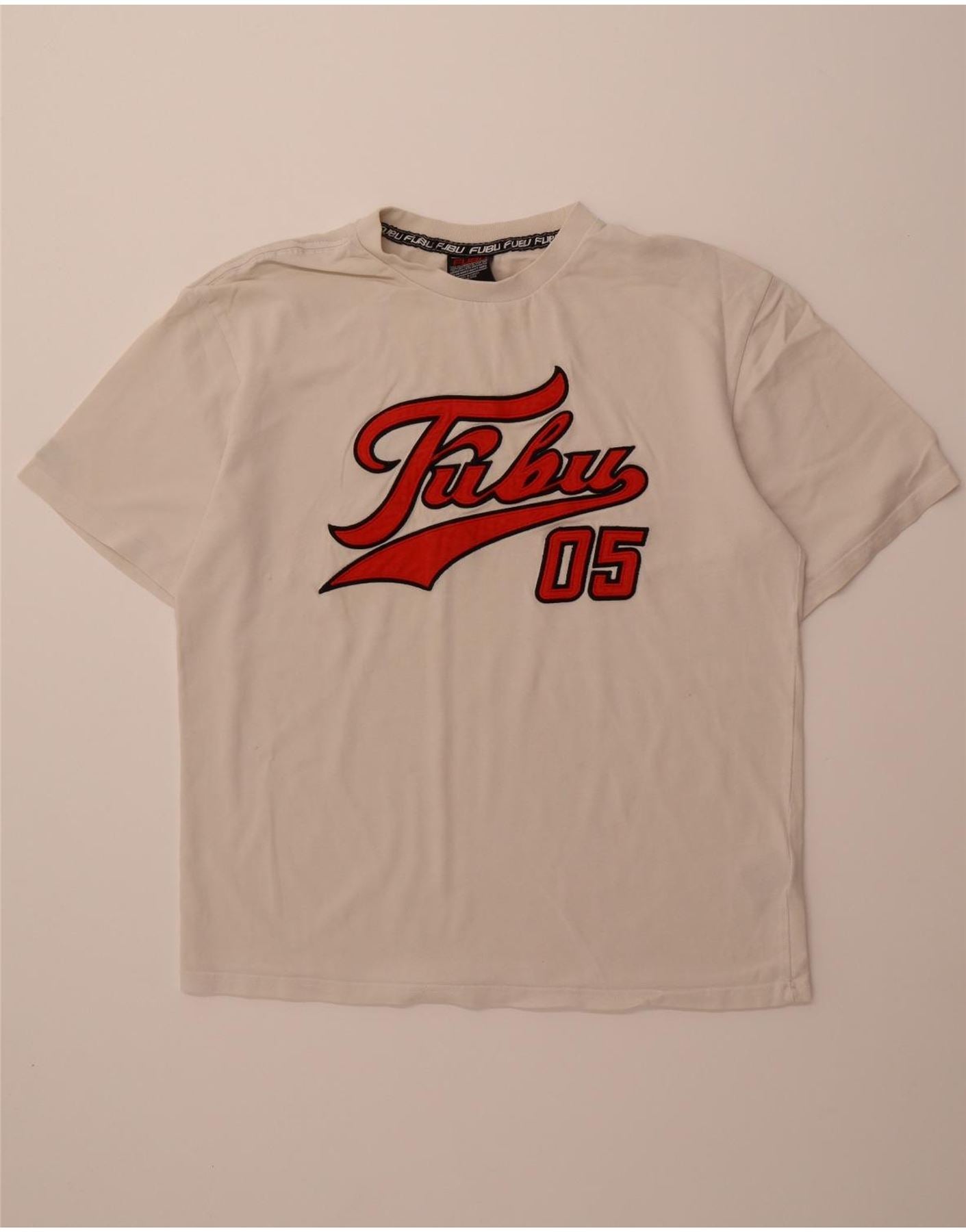 - AI Description: Vintage Fubu men's off-white graphic T-shirt. Crafted from 100% cotton jersey, this short-sleeved, round-neck top features a regular fit and a bold logo accent. Ideal for a hip-hop style, this pullover T-shirt is pre-owned and in excellent condition, with minor discoloration on the collar. Label size S. Washing instructions: Machine wash delicate, use colour detergent, wash with similar colours, wash and iron inside out. Made in Turquia.