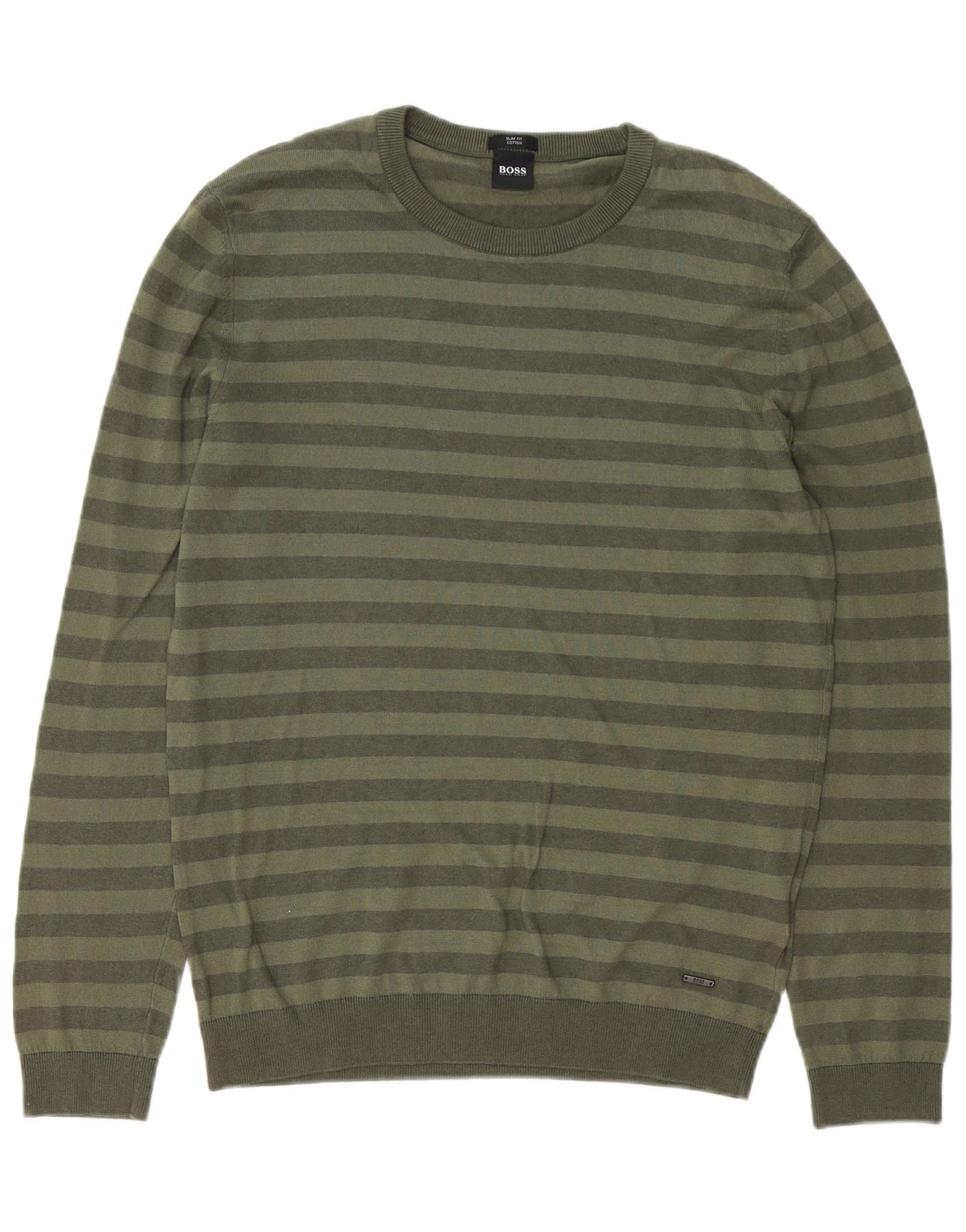 Мужской приталенный джемпер с круглым вырезом HUGO BOSS, большой зеленый полосатый свитер