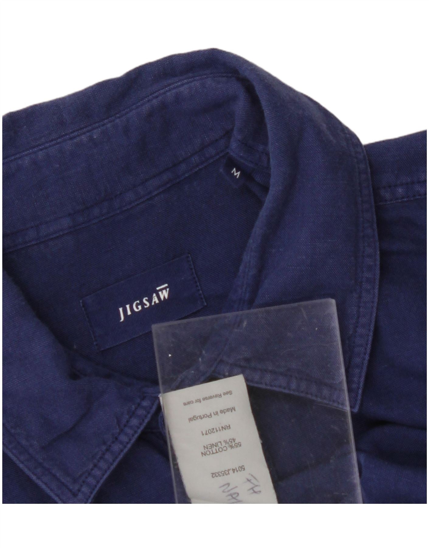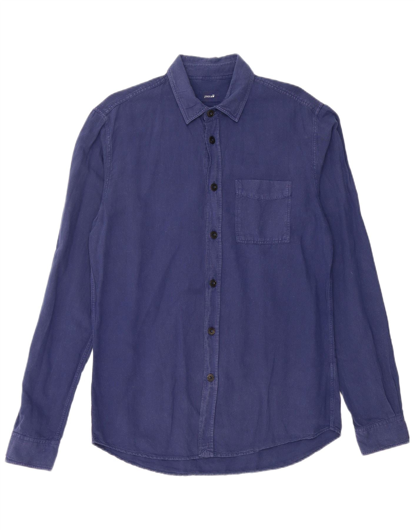 - AI Description: This Jigsaw mens shirt is crafted from a breathable cotton and linen blend, offering a comfortable feel. It features a classic collared neckline and long sleeves, perfect for versatile styling. The button-up front ensures a neat, traditional finish. With a regular fit, this shirt provides ease of movement. Subtle pockets add practical detail to this timeless design.