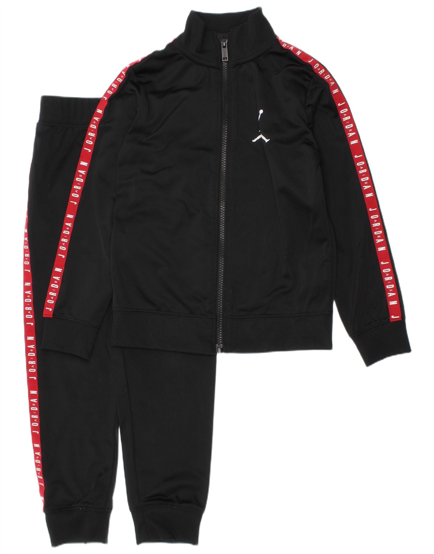 - Описание ИИ: Полный спортивный костюм Jordan для мальчиков изготовлен из гладкого черного полиэстера. Вырез с воротником и застежка-молния по всей длине создают классический спортивный силуэт. Длинные рукава имеют ребристые манжеты. Красные полоски с цветными блоками и надписью JORDAN спускаются по рукавам. Выдающийся белый логотип подчеркивает грудь. Брюки в тон имеют эластичную талию для комфорта. Зауженные брючины дополнены ребристыми манжетами. Боковые полосы повторяют дизайн куртки. На ножке также присутствует белый логотип. Этот комплект стандартного кроя идеально подходит для спортивной или повседневной одежды.