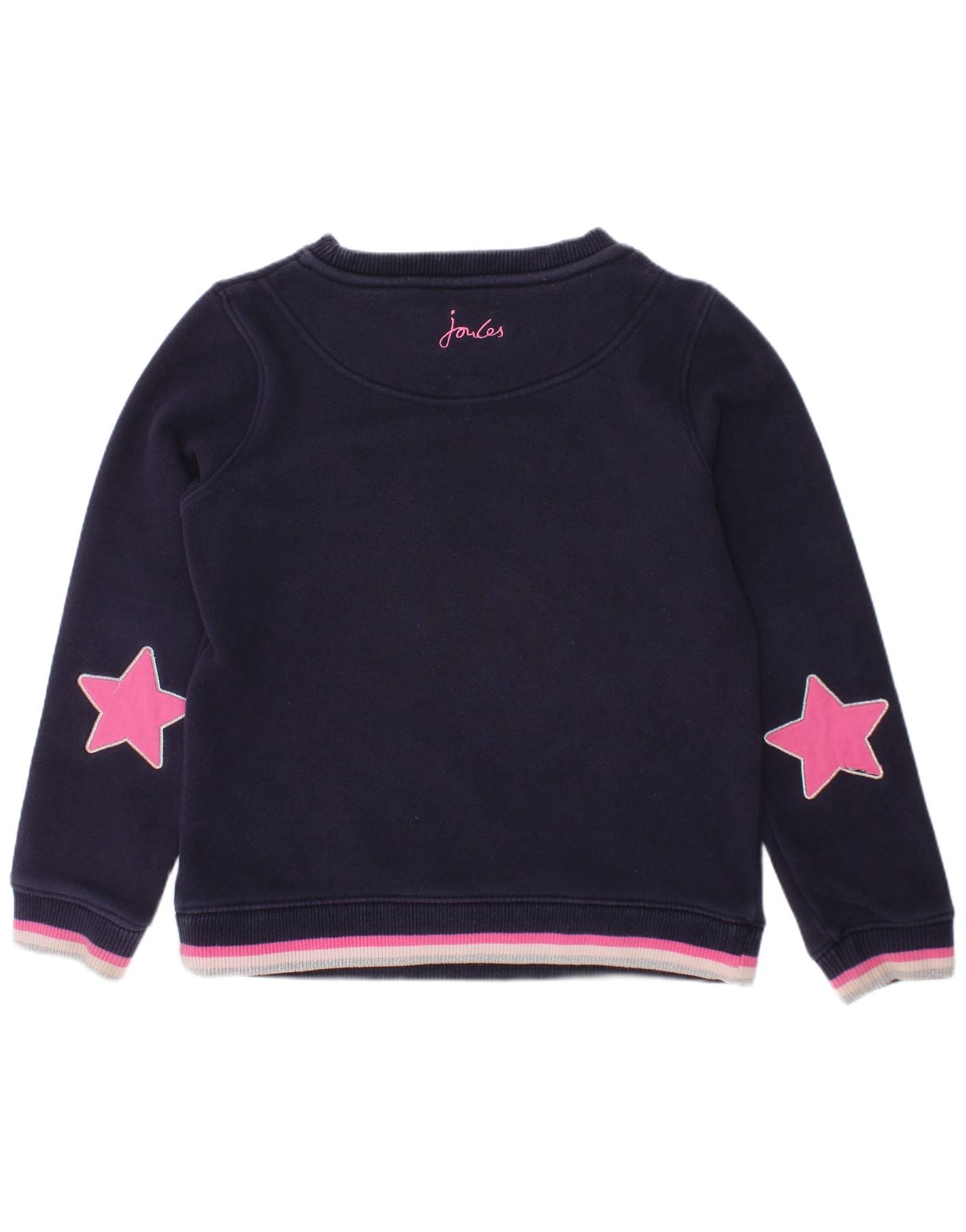 - Описание ИИ: Джемпер-толстовка для девочек Joules изготовлен из мягкого 100-процентного хлопкового трикотажа темно-синего цвета. Имеет классический круглый вырез и длинные рукава. На лицевой стороне изображен очаровательный рисунок единорога, украшенный мерцающими пайетками. Аппликации в виде розовых звезд украшают рукава, придавая изделию игривый вид. Полосатые манжеты и подол создают аккуратный вид. Этот пуловер обеспечивает удобную посадку для повседневного ношения.