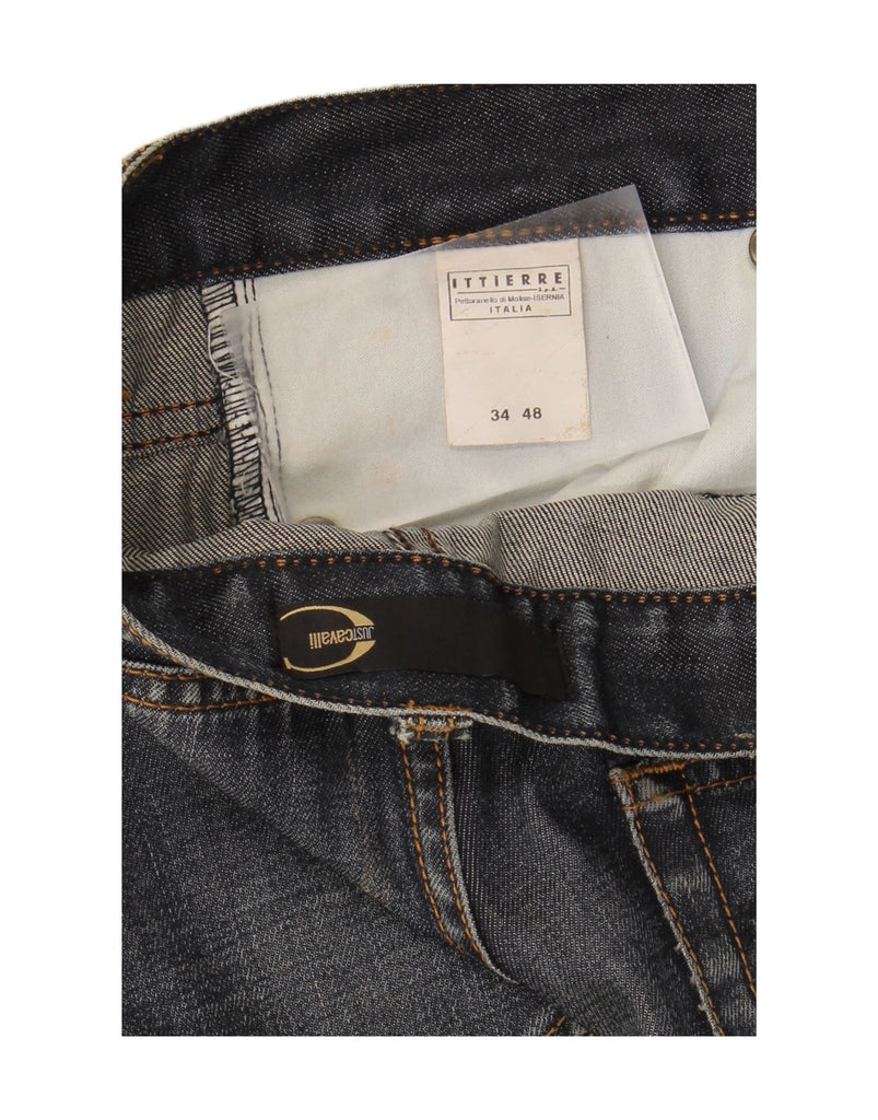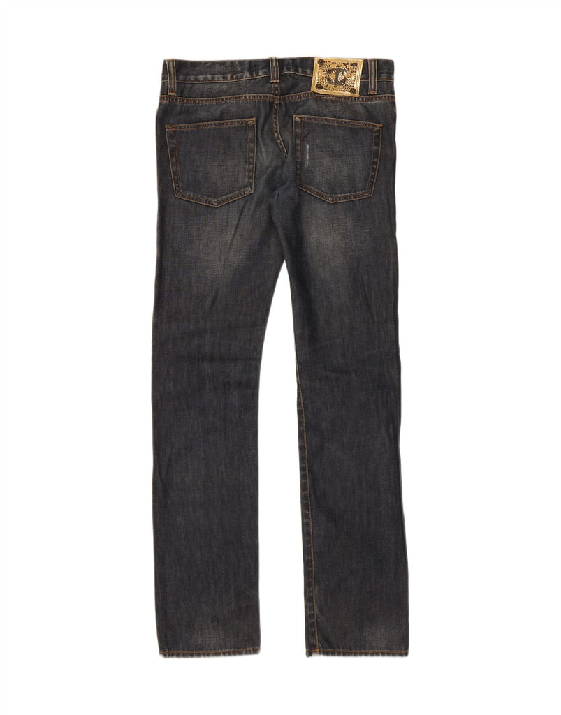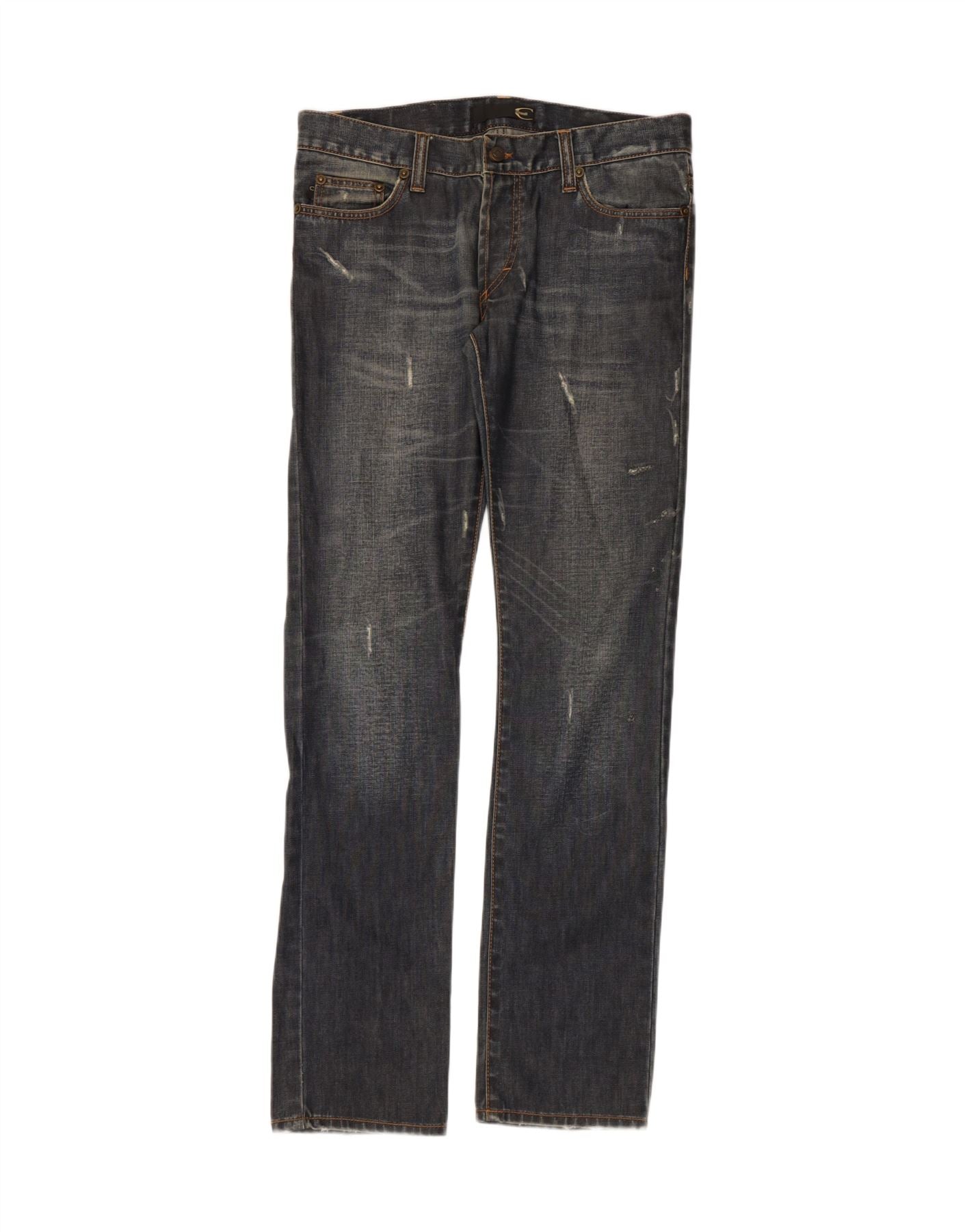 - AI Description: These Just Cavalli men’s straight jeans are crafted from blue distressed denim for an authentic, lived-in feel. The straight cut offers a comfortable regular fit throughout the leg. A classic button closure secures the waist, complemented by functional pockets. The distressed detailing adds a rugged, contemporary edge to the design. This style brings a grunge aesthetic, perfect for casual wear.
