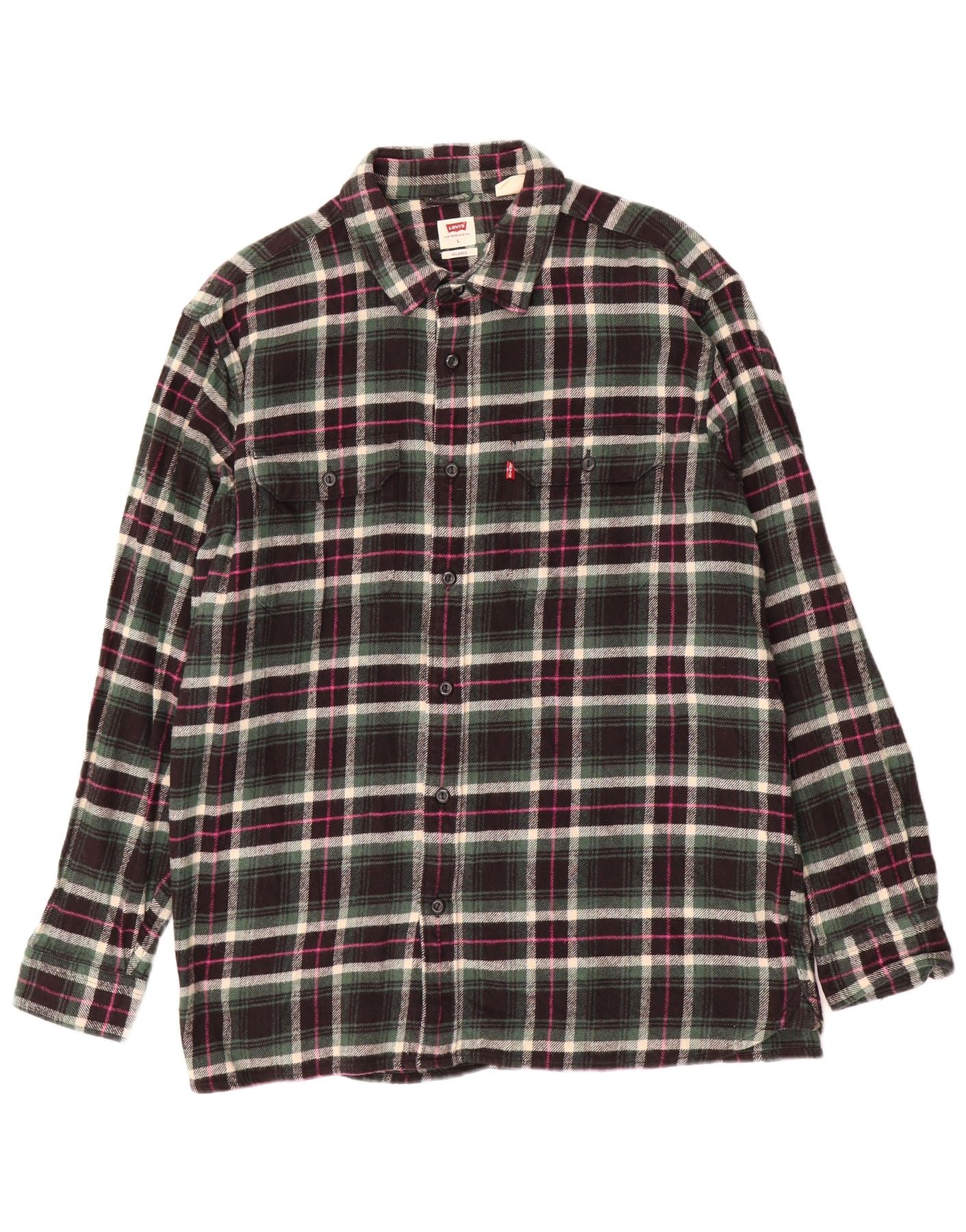 - Описание ИИ: Мужская фланелевая рубашка Levis изготовлена из мягкой фланели из 100% хлопка. Имеет классический вырез горловины и застежку на пуговицы спереди. Свободная посадка обеспечивает комфортное ношение. Длинные рукава заканчиваются аккуратными манжетами на пуговицах. Характерный клетчатый узор черного, зеленого, белого и розового цветов добавляет визуальный интерес. Два нагрудных кармана обеспечивают практичность. Эта рубашка создает вневременной повседневный стиль.