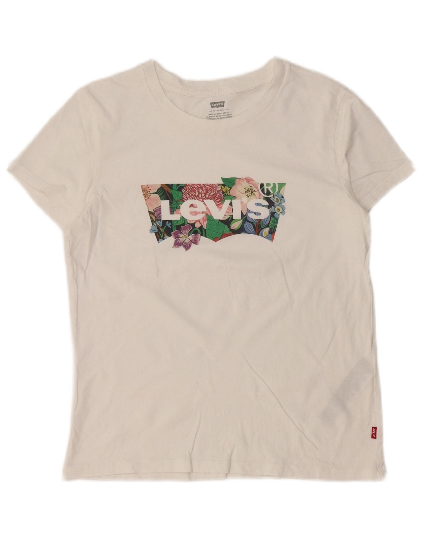- Описание ИИ: Женская футболка с рисунком Levi's изготовлена из мягкого хлопкового джерси белого цвета. Имеет классический круглый вырез и короткие рукава. Спереди изображен характерный цветочный узор внутри культового логотипа Levi's. Классический крой обеспечивает удобство ношения и универсальный силуэт. Этот топ сочетает в себе повседневный стиль со свежей женственностью и идеально подходит для повседневной носки.
