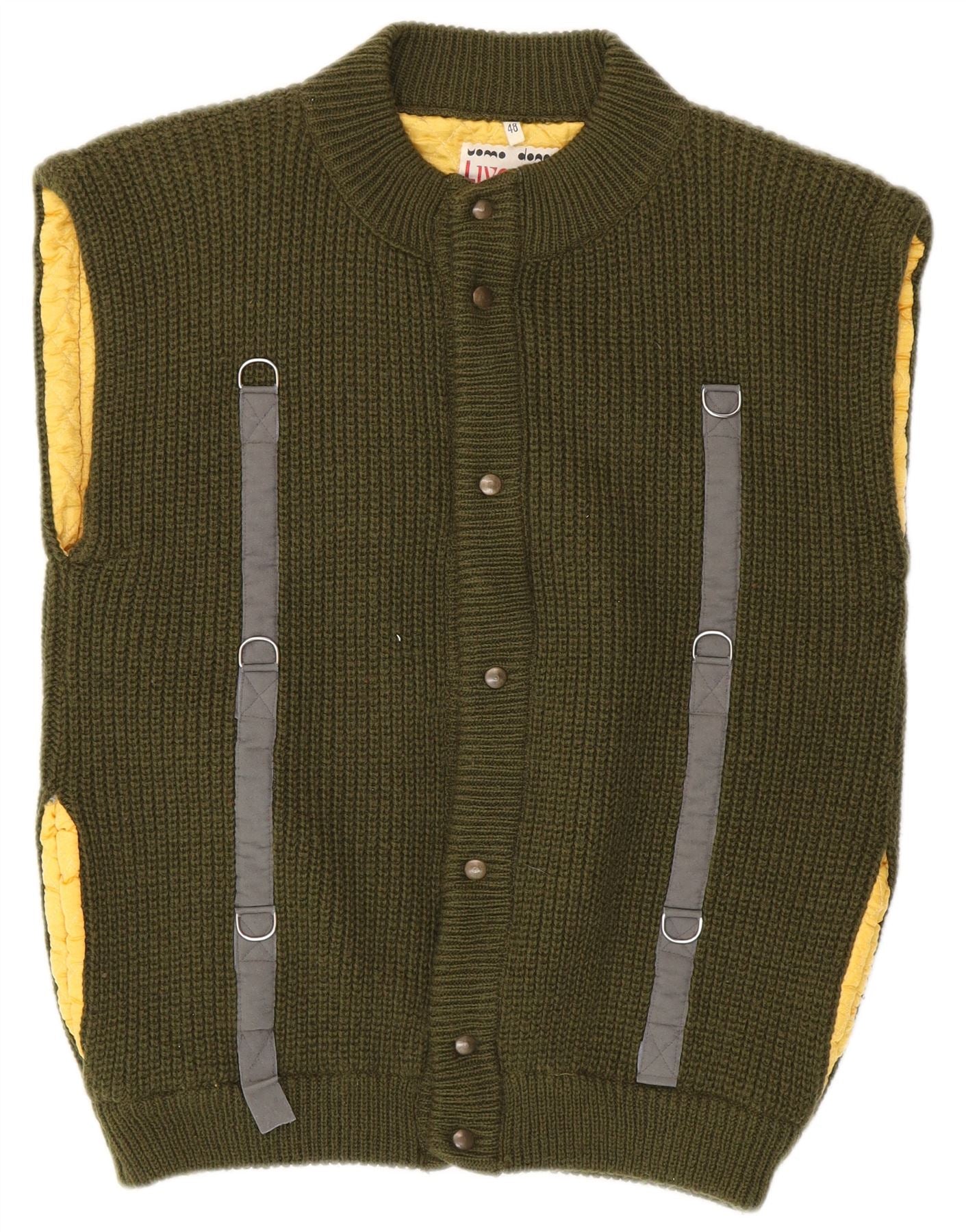 - Описание ИИ: Мужской жилет Liverani изготовлен из прочного трикотажа из шерсти и акрила, обеспечивающего тепло и текстуру. Имеет глубокий зеленый оттенок. Модель без рукавов имеет высокий воротник и стандартную посадку. Застежка на пять пуговиц спереди обеспечивает классическую деталь. Он полностью на подкладке и набит для комфорта. Характерные акценты на ремешках придают модели уникальный вид.