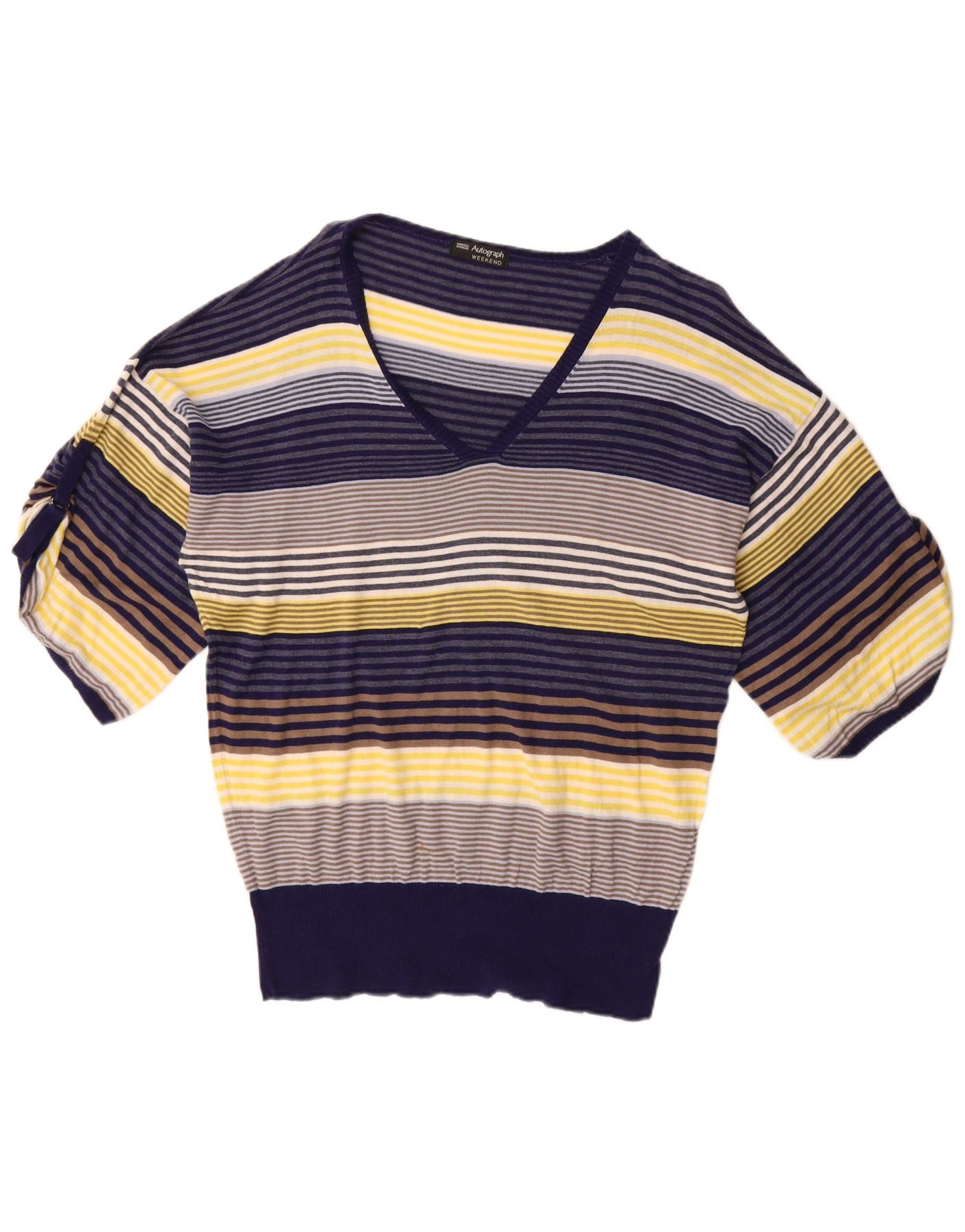- Описание ИИ: Женский джемпер с V-образным вырезом Marks & Spencer изготовлен из легкой трикотажной ткани, обеспечивающей комфорт. Модель имеет классический V-образный вырез и короткие рукава со сборкой. Регулярная посадка обеспечивает удобство ношения. Яркий полосатый узор темно-синего, желтого, серого и коричневого цветов добавляет визуальный интерес. Этот пуловер одновременно современный и универсальный, идеально подходит для повседневного стиля.