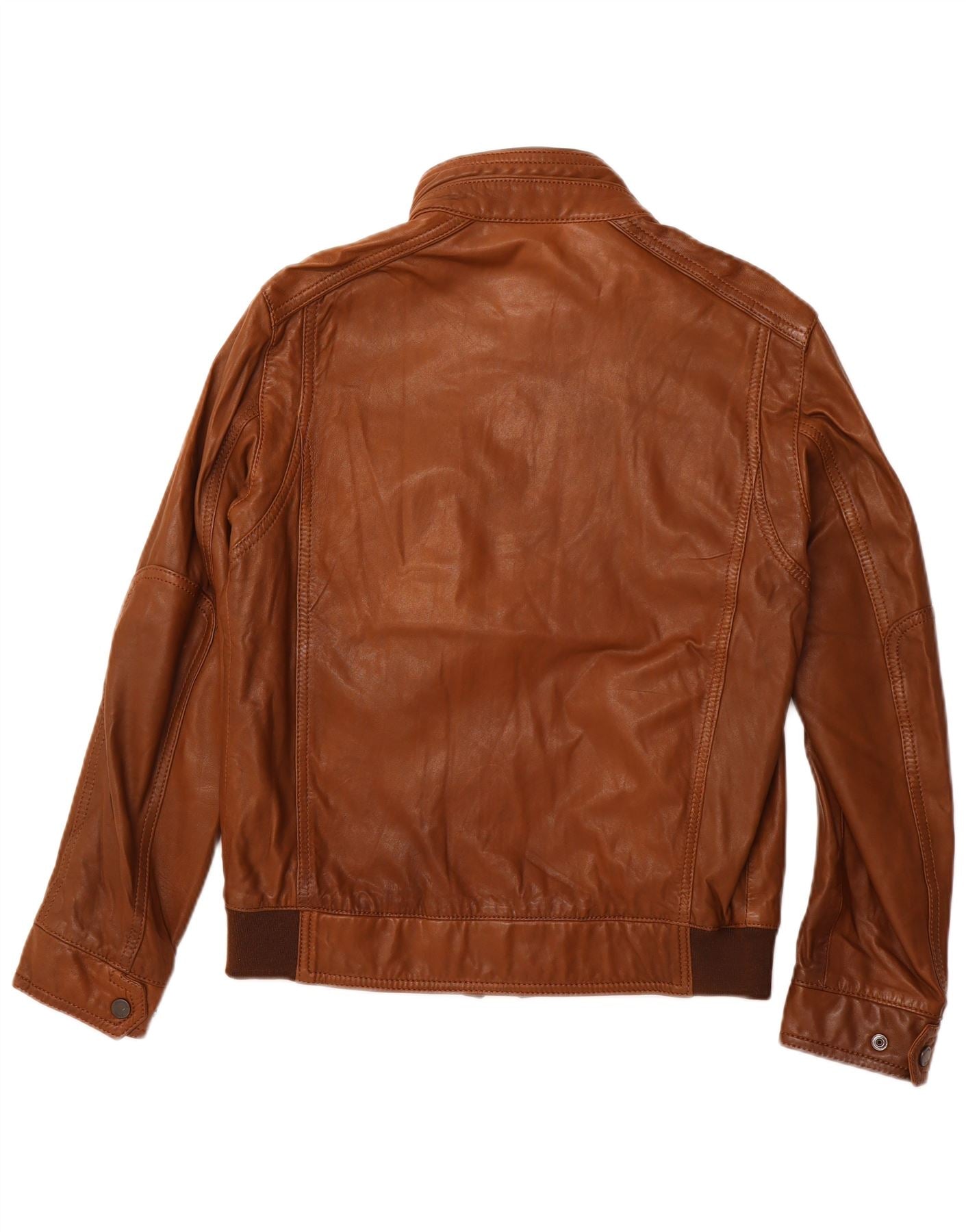 - AI Description: This Massimo Dutti mens bomber jacket is crafted from luxurious brown lambskin leather. It features a classic collared neckline and a full zip closure for a sleek finish. Long sleeves and a regular fit ensure comfortable wear. Practical pockets add functionality. The biker style offers a timeless, rugged appeal.