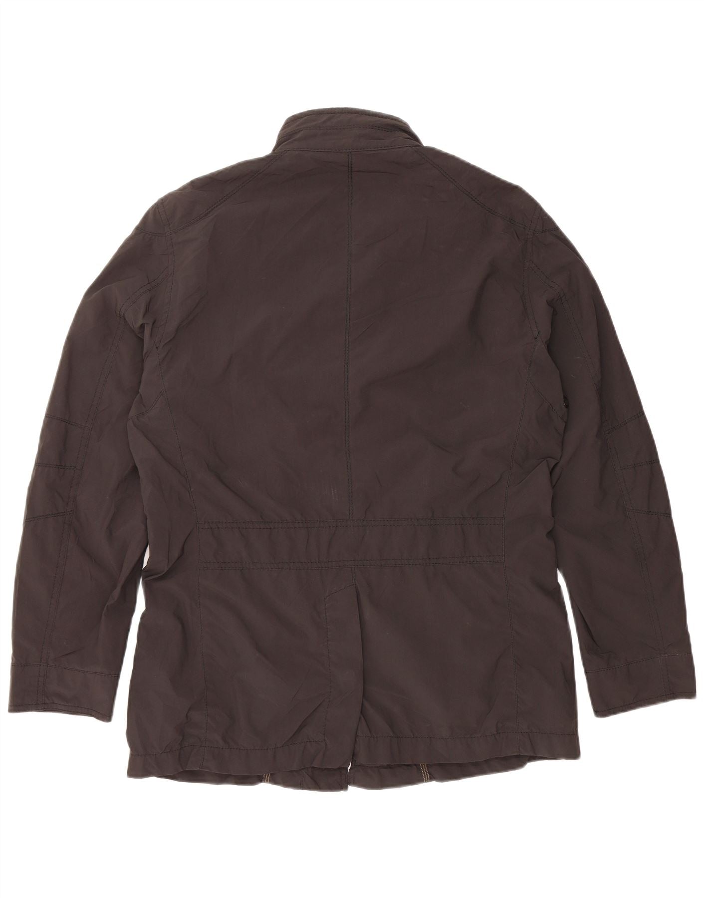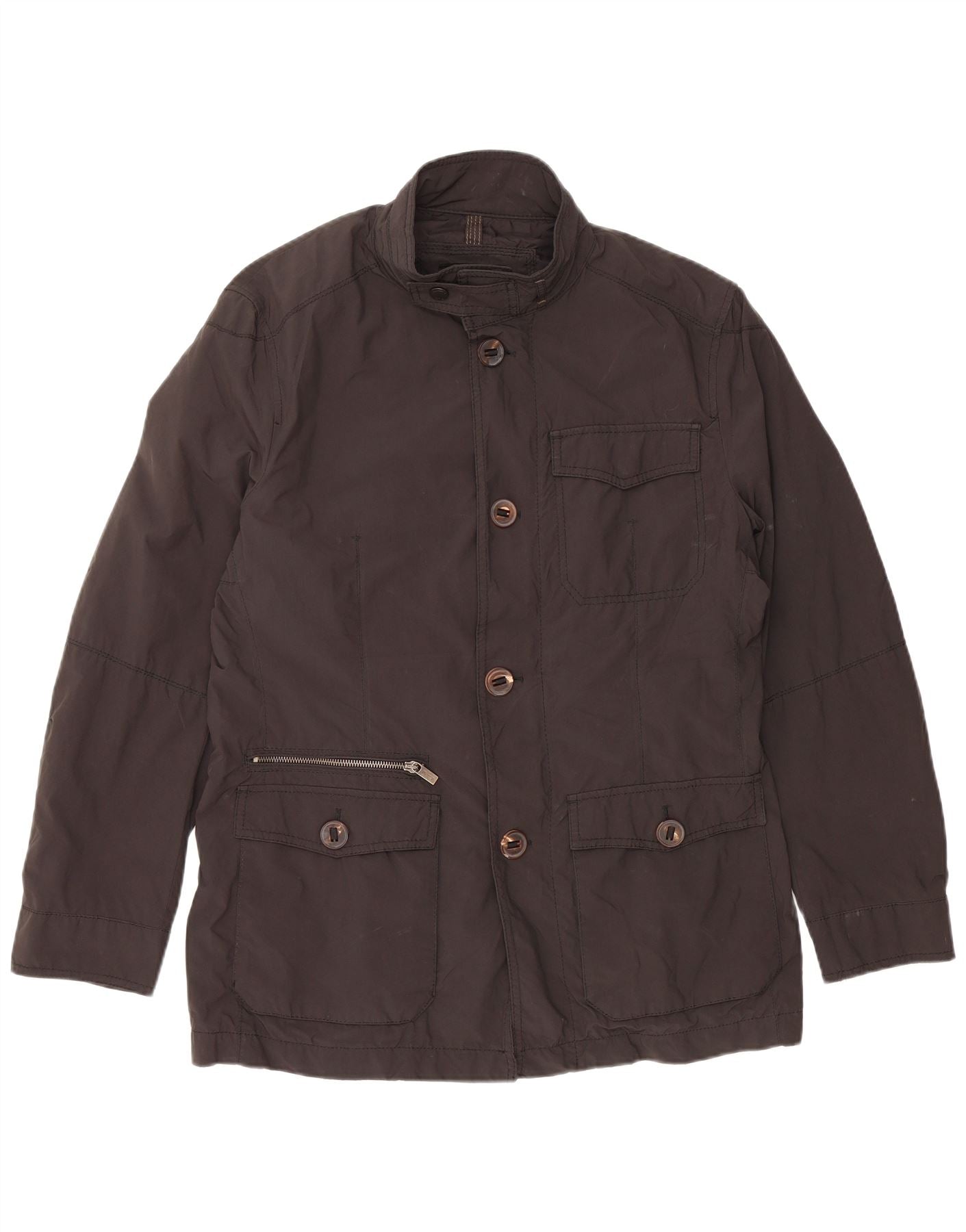 - AI Description: This Massimo Dutti mens utility jacket is crafted from a durable cotton and nylon blend, offering a robust yet comfortable feel. Its woven, padded construction provides warmth and structure. It features a classic collared neckline and long sleeves. The regular fit ensures comfortable wear. A full zip closure is concealed by a button placket. Multiple pockets add practical utility and a military-inspired aesthetic. Tonal buttons serve as a refined accent.