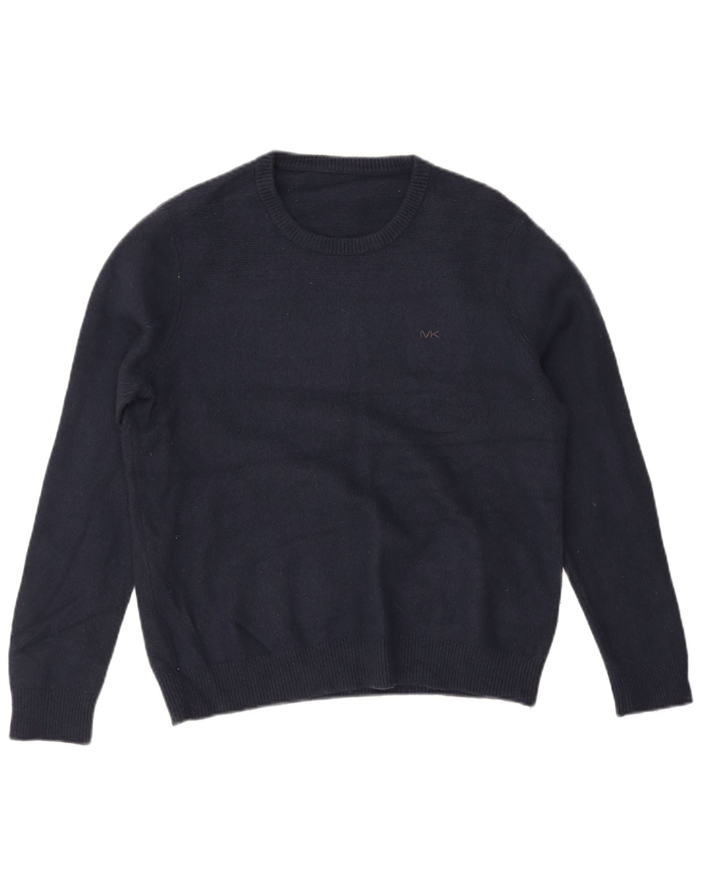 - AI Description: This Vintage mens Crew Neck Jumper Sweater is crafted from luxurious 100 percent cashmere knit. Its deep navy blue hue offers classic versatility. The round neckline and long sleeves provide a timeless silhouette. A regular fit ensures comfortable wear and easy layering. A subtle MK logo accent adds a refined branded touch. This pullover design combines warmth with understated elegance.